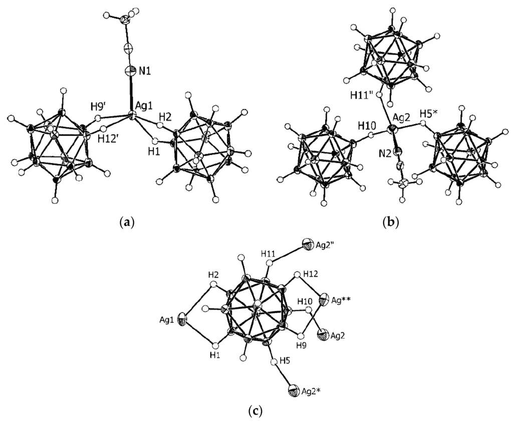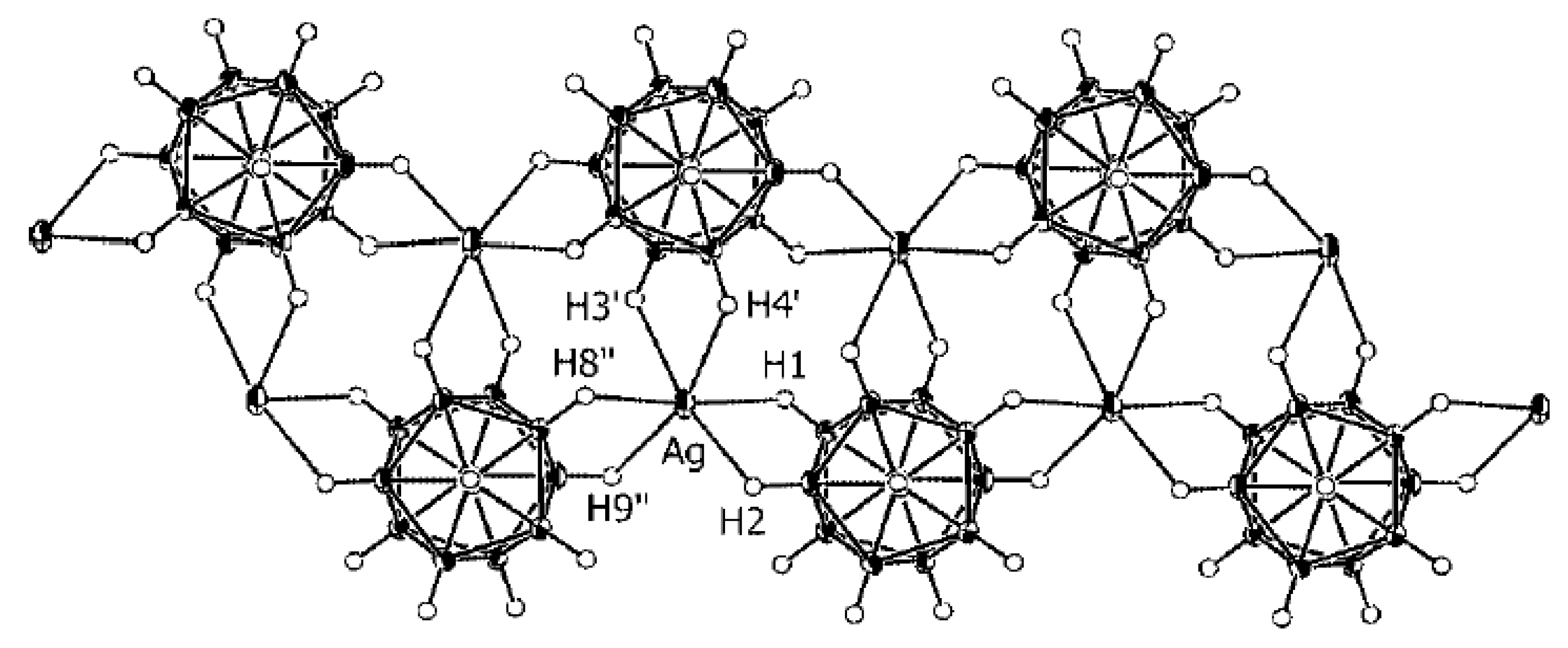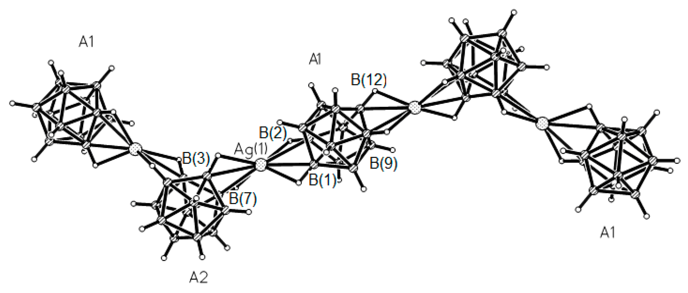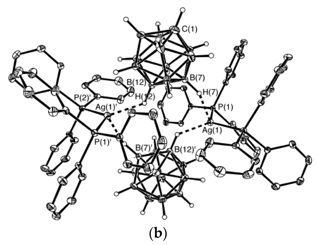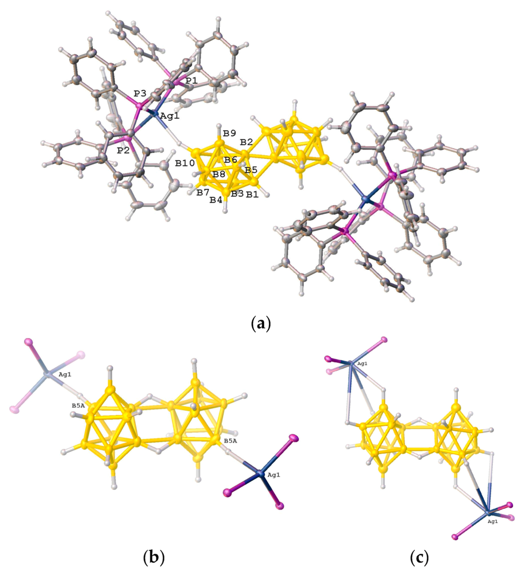 - Drozdova, V.V.; Malinina, E.A.; Goeva, L.V.; Polyakova, I.N.; Kuznetsov, N.T. Synthesis and structure of the polymeric complex [Ag2(Ph3P)2B10H10]n. Russ. J. Inorg. Chem. 2010, 55, 34–39. [Google Scholar] [CrossRef]