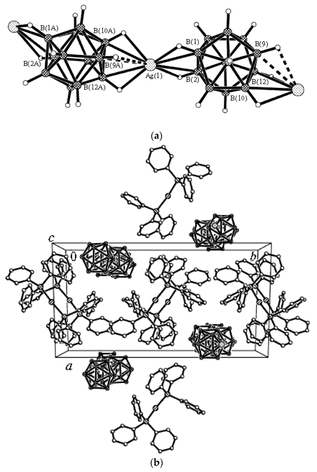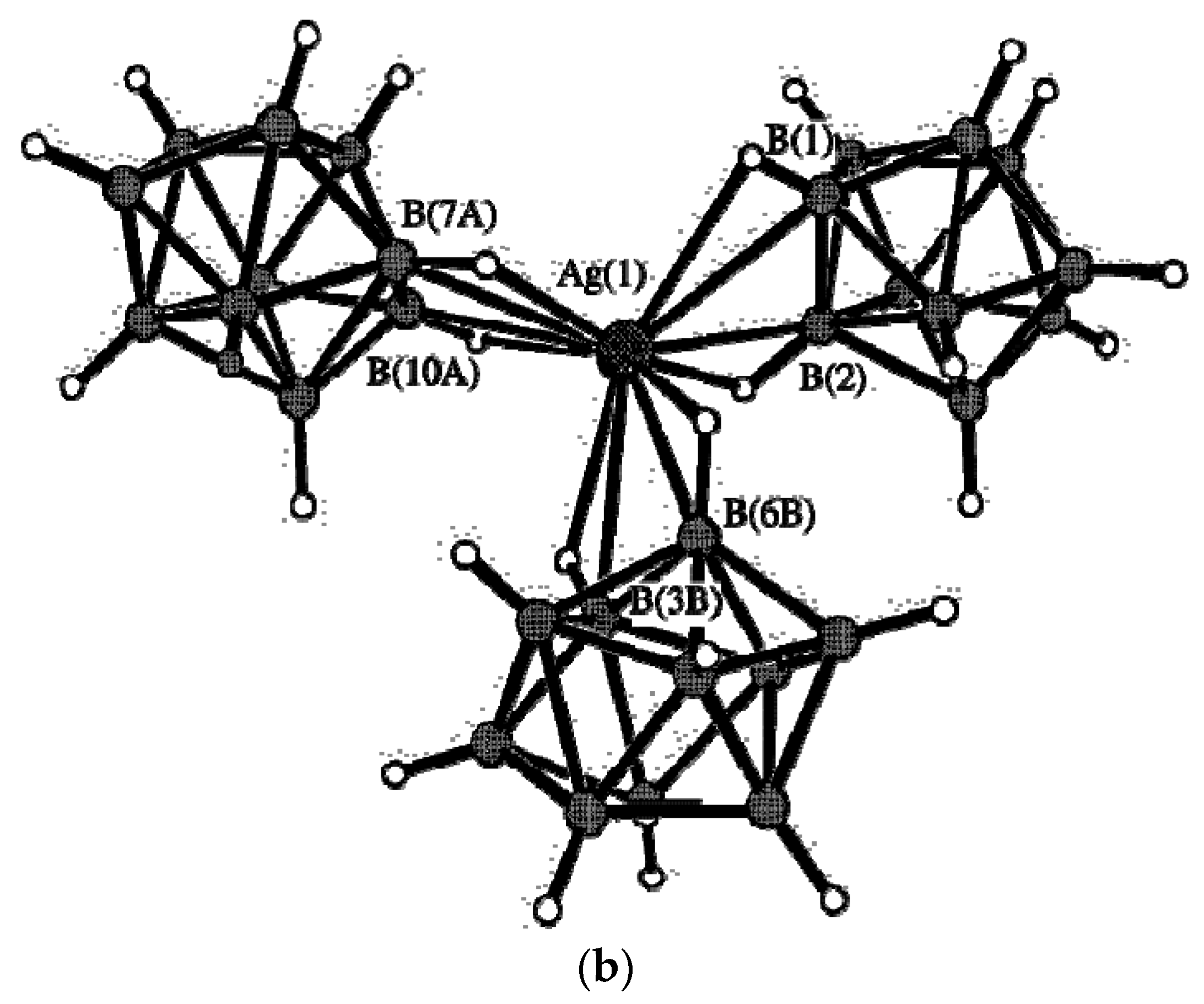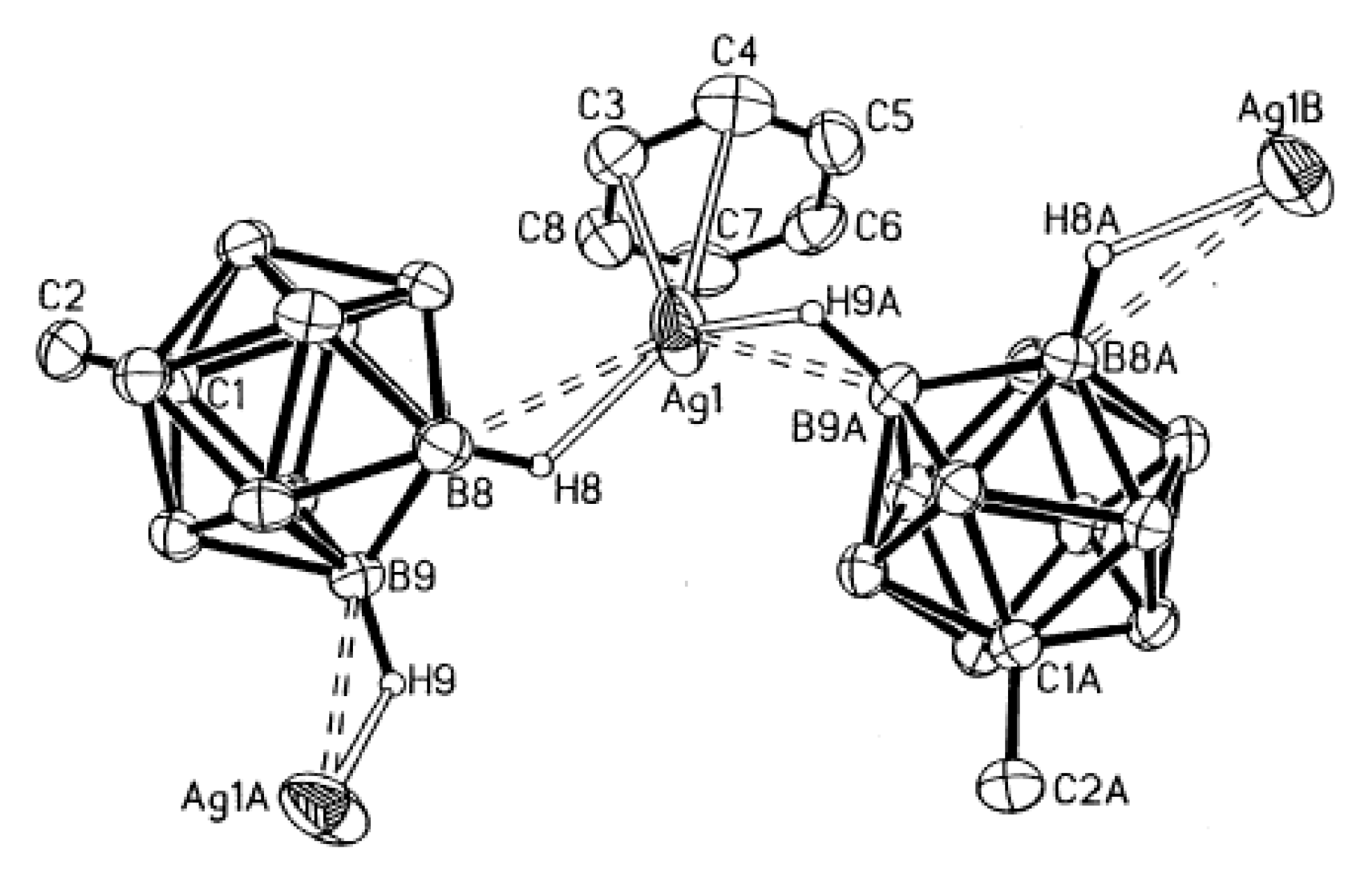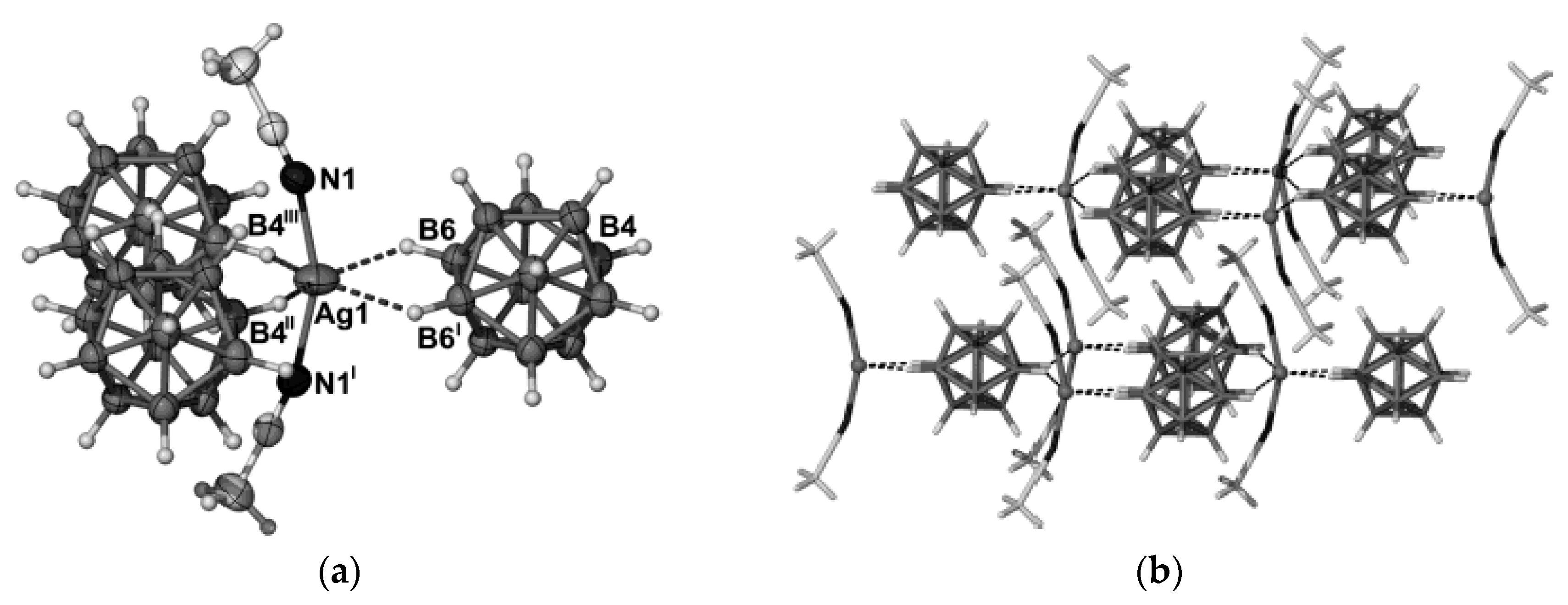 - Drozdova, V.V.; Malinina, E.A.; Goeva, L.V.; Polyakova, I.N.; Kuznetsov, N.T. Synthesis and structure of the polymeric complex [Ag2(Ph3P)2B10H10]n. Russ. J. Inorg. Chem. 2010, 55, 34–39. [Google Scholar] [CrossRef]