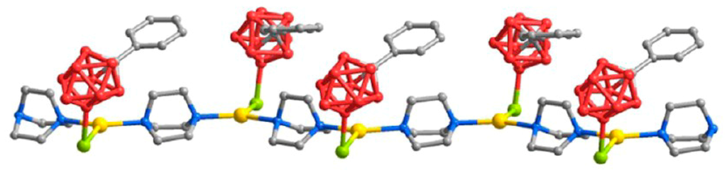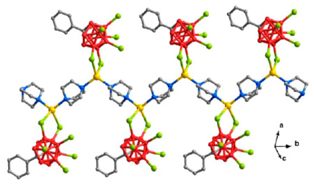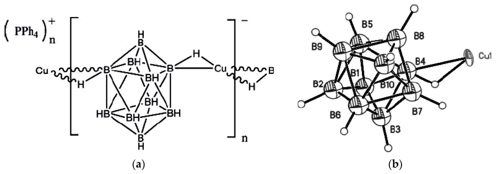 Structure of polymeric complex {(Ph4P)(CuB10H10])}n: (a) structural formula; (b) fragment of polymeric chain {{Cu[B10H10]}nn−. Reproduced with permission from reference [14]. Copyright © (2016) Elsevier.