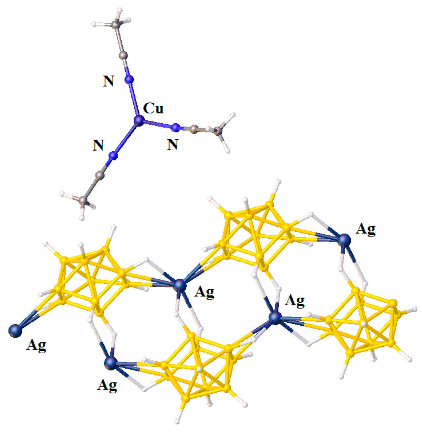The unusual complex {[Cu(MeCN)3](Ag[B10H10])}n was prepared by the reaction of Cu2[B10H10] and Ag2[B10H10] in acetonitrile in the presence of trifluoroacetic acid. The silver cation is coordinated by two closo-decaborate anions through Ba-Be edges (Ag…Ba and Ag…Be bond lengths are 2.656(8) and 2.547(7) Å, respectively) and one closo-decaborate anion through Be-Be’ edge (Ag…Be 2.758(9) Å). The trigonal-planar environment of copper cation is formed by acetonitrile nitrogen atoms. Two elongated contacts with the BH groups supplements the Cu+ coordination to trigonal bipyramidal (Cu…B(H), 3.319(7) Å; Cu…H(B), 2.40(7) Å) (Figure 6) [28].