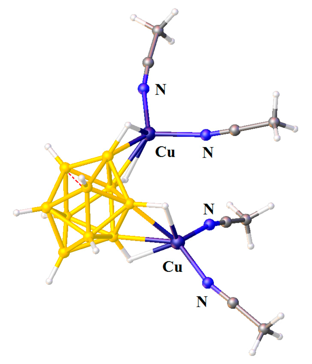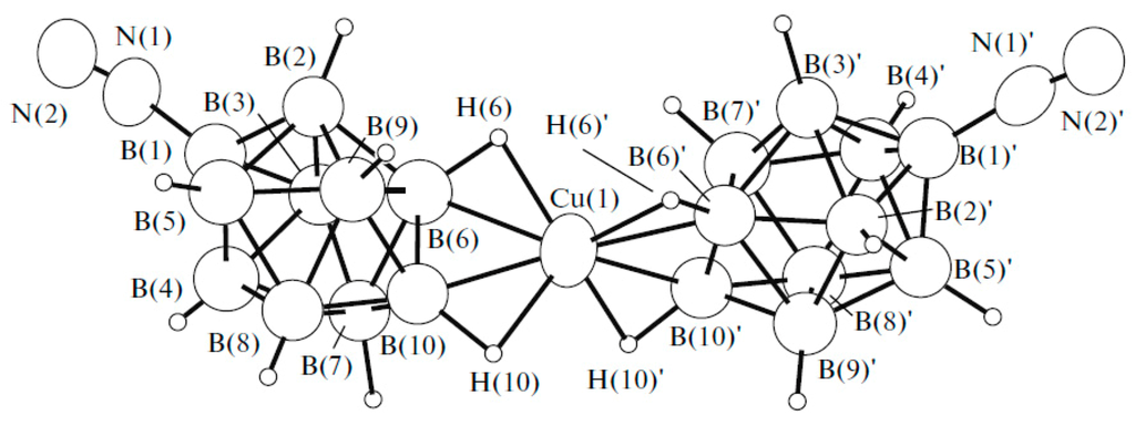 Recrystallization of {Cu2[B10H10]}n from acetonitrile solution in the presence of trifluoroacetic acid gave complex {((MeCN)2Cu)2[B10H10]} with two [(MeCN)2Cu]+ fragments coordinated to B(1)-B(2) and B(3)-B(6) edges [28] (Figure 9).