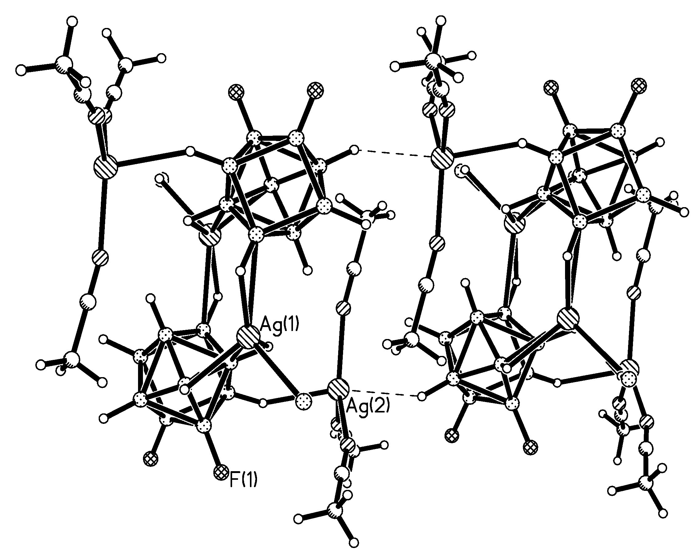 Complex {[(MeCN)3Ag](Ag[2-B10H9F])}2 was prepared by the treatment of (Ph4P)2[2-B10H9F] with silver trifluoroacetate in 9:1 dichloromethane-toluene solution followed by crystallization from acetonitrile. The structure of the {[(MeCN)3Ag](Ag[2-B10H9F])}2 complex consists of dimeric {Ag[2-B10H9F]}22− units weakly interacting with two nearly planar [(MeCN)3Ag]+ cations (Ag…B and Ag…H(B) distances are 2.520–2.644(5) and 2.02–2.36(5) Å, respectively) [32]. There is no interaction between the fluorine substituent in boron cage and either silver cation (Figure 10) [14].