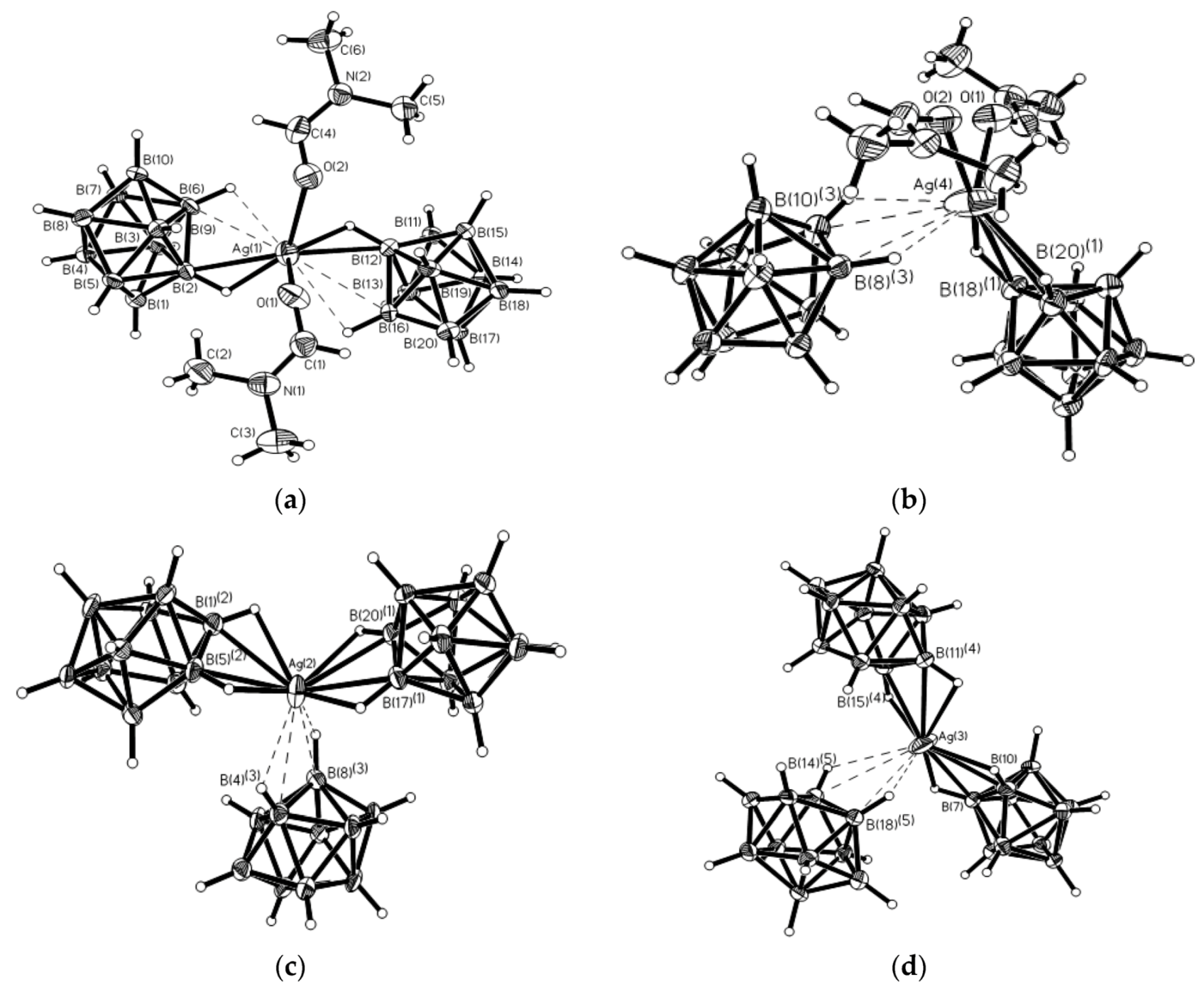 The crystal environment of silver cations in structure of {Ag2(DMF)[B10H10]}n: (a) Ag(1); (b) Ag(4); (c) Ag(2); and (d) Ag(3). Reproduced with permission from reference [33]. Copyright © (2008) Springer.