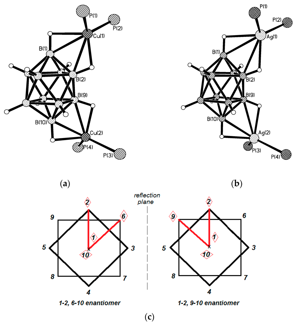 Molecular structure of 1–2, 9–10 {((Ph3P)2M)2[B10H10]}: M = Cu (a); M = Ag (b); schematic representation of cocrystallized 1–2, 6–10 and 1–2, 9–10 enantiomers (hereinafter view from the top of the boron cage) (c). Phenyl cycles are omitted for clarity. Reproduced with permission from reference [14]. Copyright © (2016) Elsevier.