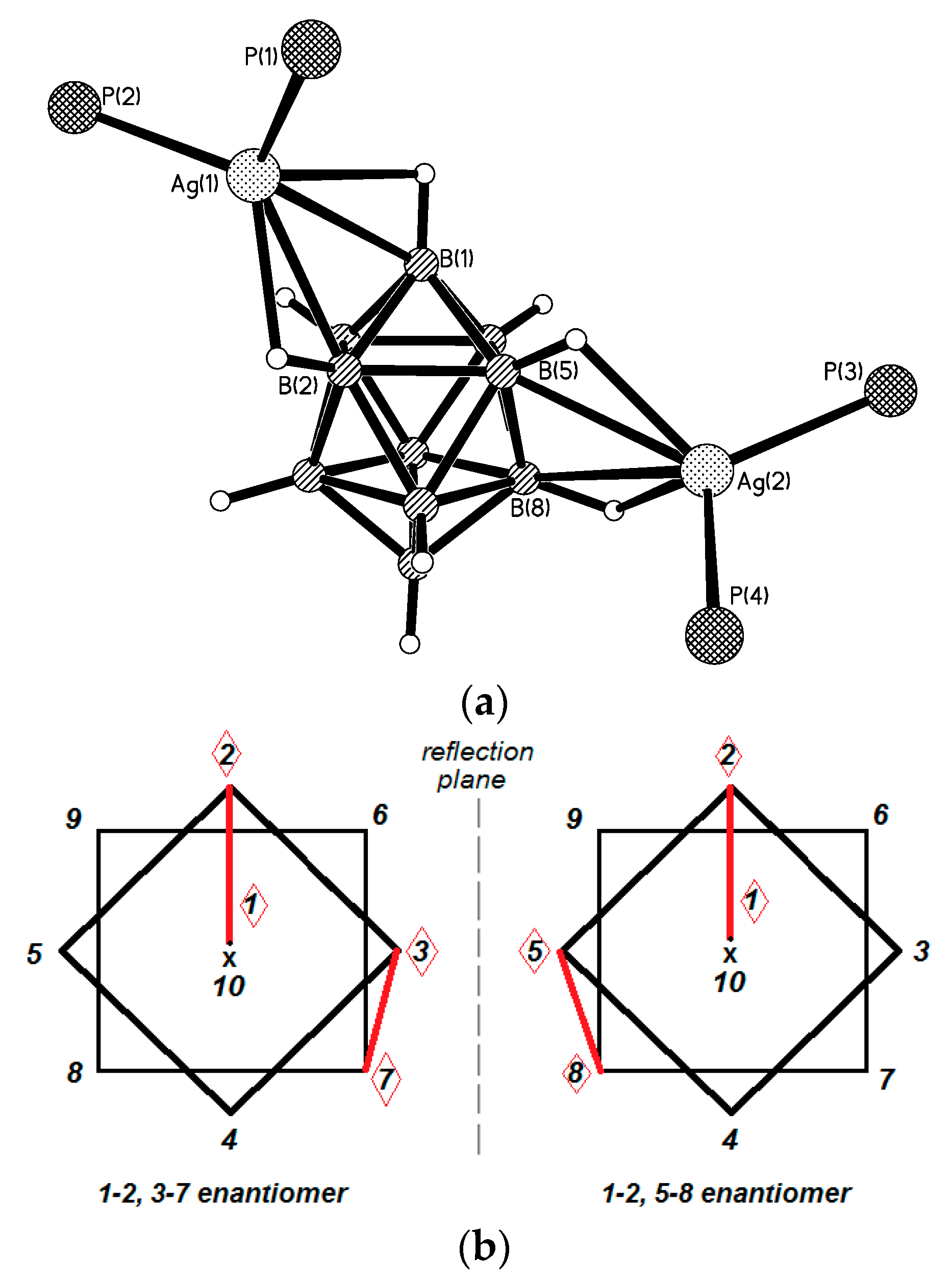 Molecular structure of 1–2, 5–8 {((Ph3P)2Ag)2[B10H10]} (a) and schematic representation of cocrystallized 1–2, 3–7 and 1–2, 5–8 enantiomers (b). Reproduced with permission from reference [14]. Copyright © (2016) Elsevier.