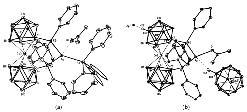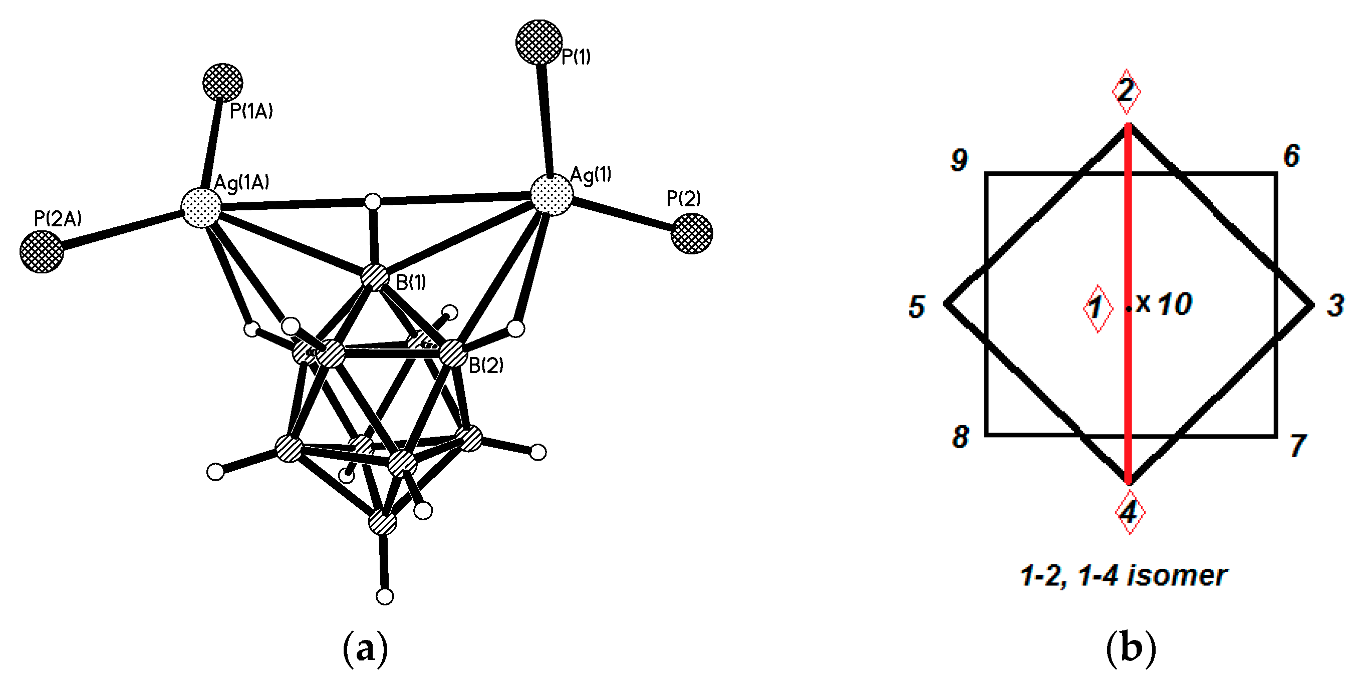 Molecular structures of 1–2, 1–4 {((Ph3P)2Ag)2[B10H10]} complex (a) and schematic representation of the 1–2, 1–4 positional isomer (b). Reproduced with permission from reference [14]. Copyright © (2016) Elsevier.