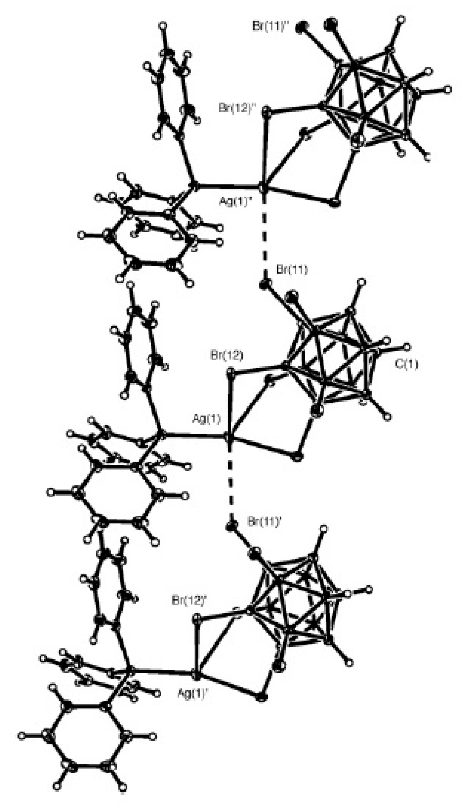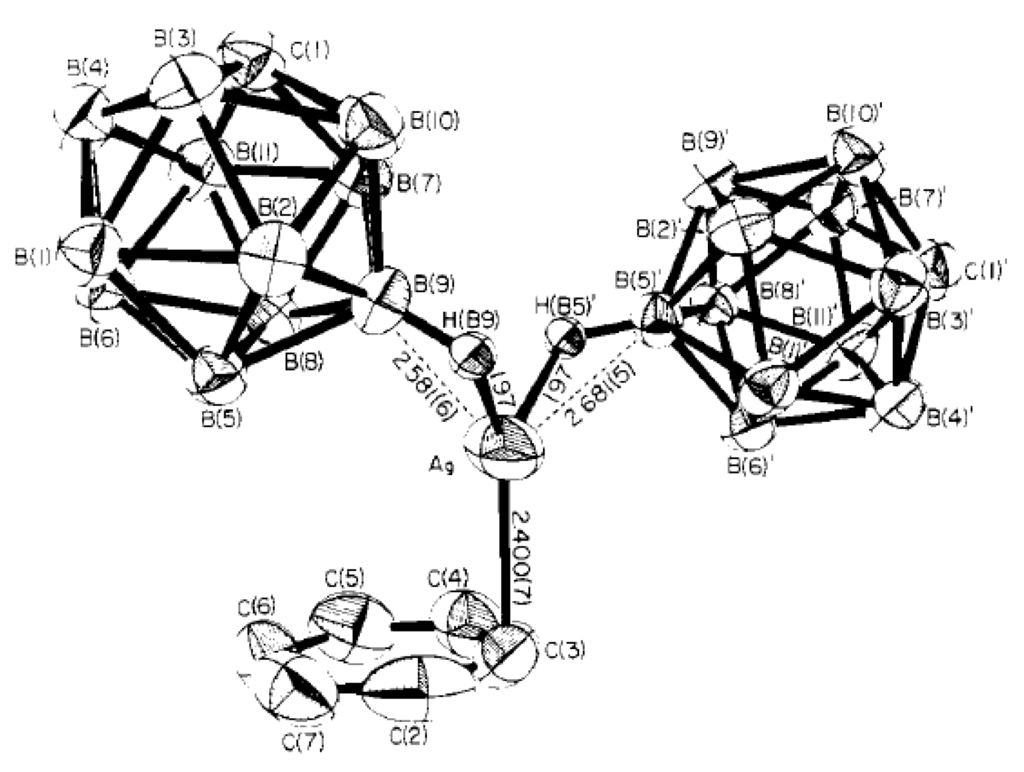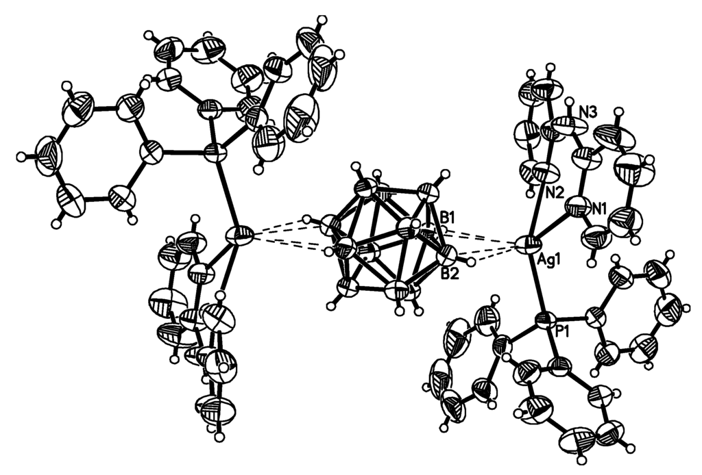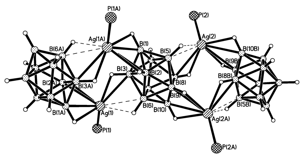 Fragment of the X-ray structure of {((Ph3P)Ag)2[B10Н10]}. Reproduced with permission from reference [38]. Copyright © (2010) Springer.