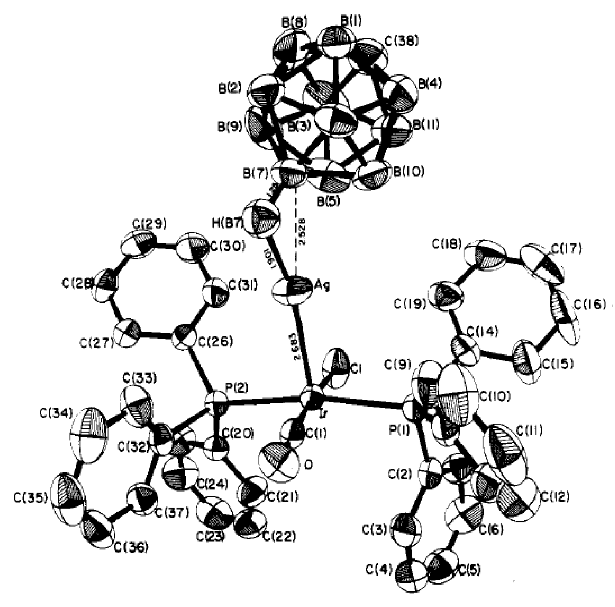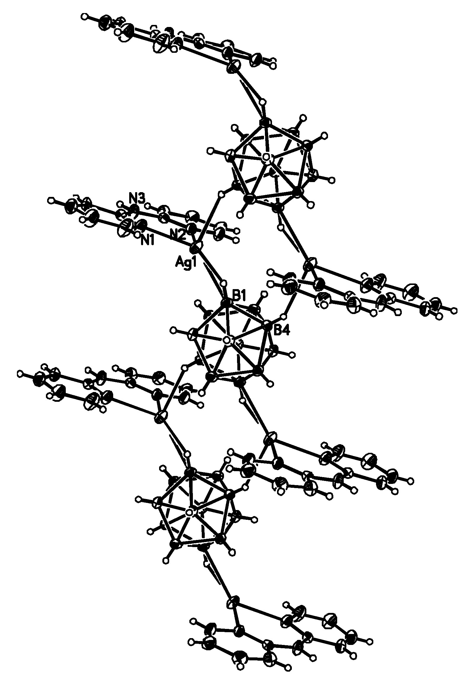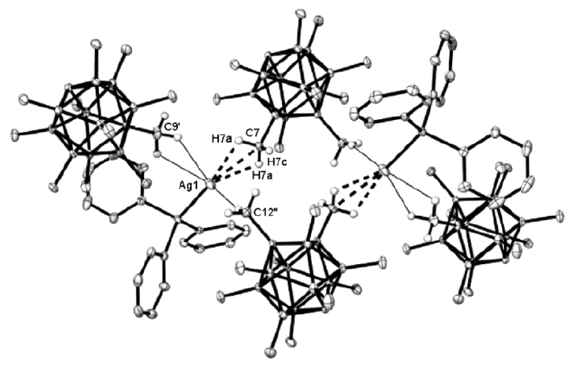 Fragment of the X-ray structure of {((Ph3P)Ag)2[B10Н10]}. Reproduced with permission from reference [38]. Copyright © (2010) Springer.