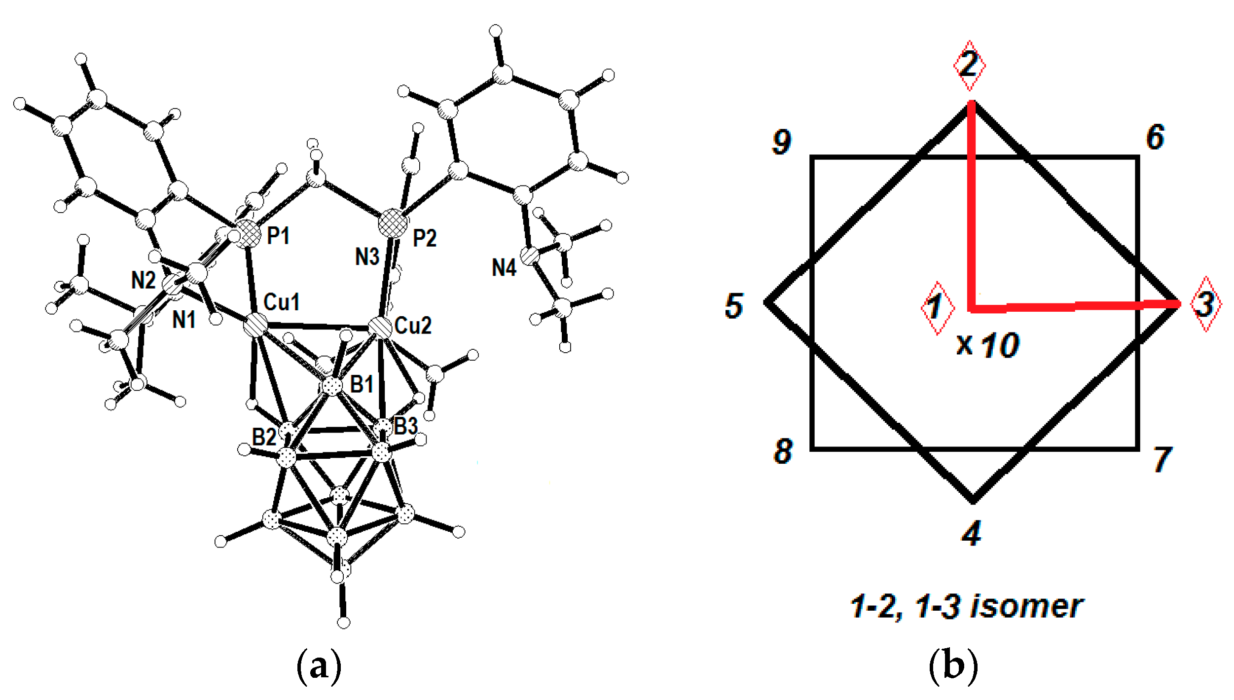 Molecular structure of {(dmapm)Cu2[B10H10]} complex (a) and schematic representation of 1–2, 1–3 positional isomer (b). Reproduced with permission from reference [14]. Copyright © (2016) Elsevier.