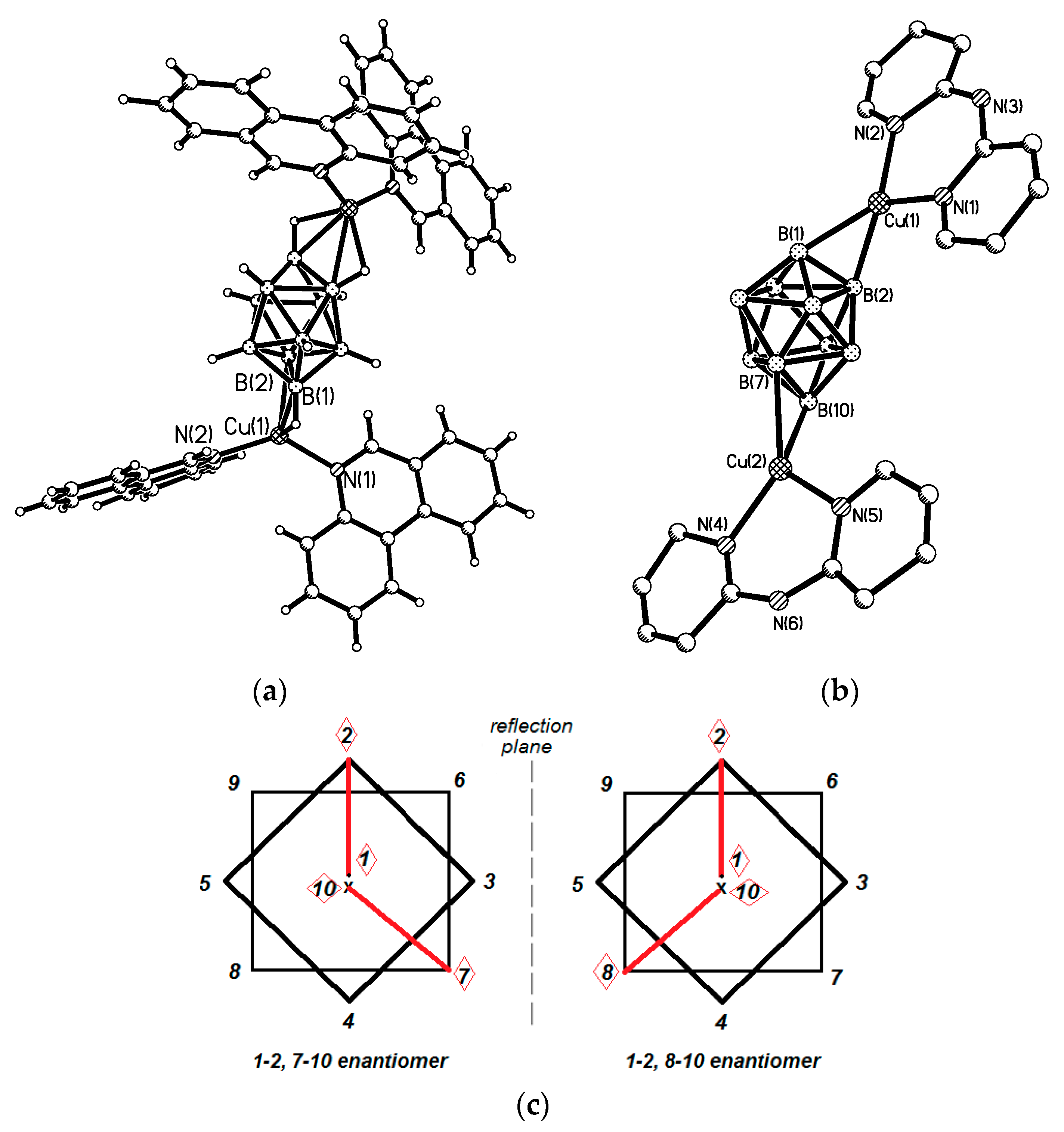 Structures of 1–2, 7–10 enantiomers of {((5NPhen)2Cu)2[B10H10]} (a) and {((BPa)Cu)2[B10H10]} (b) and schematic representation of 1–2, 7(8)–10 enantiomers (c). Reproduced with permission from reference [14]. Copyright © (2016) Elsevier.