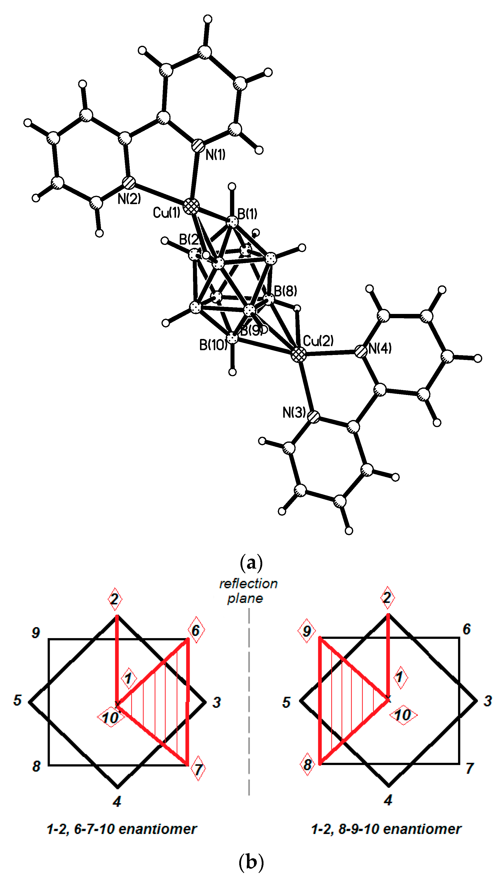 Structure of {((2,2′-Bipy)Cu)2[B10H10]} (a) and schematic representation of the cocristallized enantiomers (b). Reproduced with permission from reference [14]. Copyright © (2016) Elsevier.