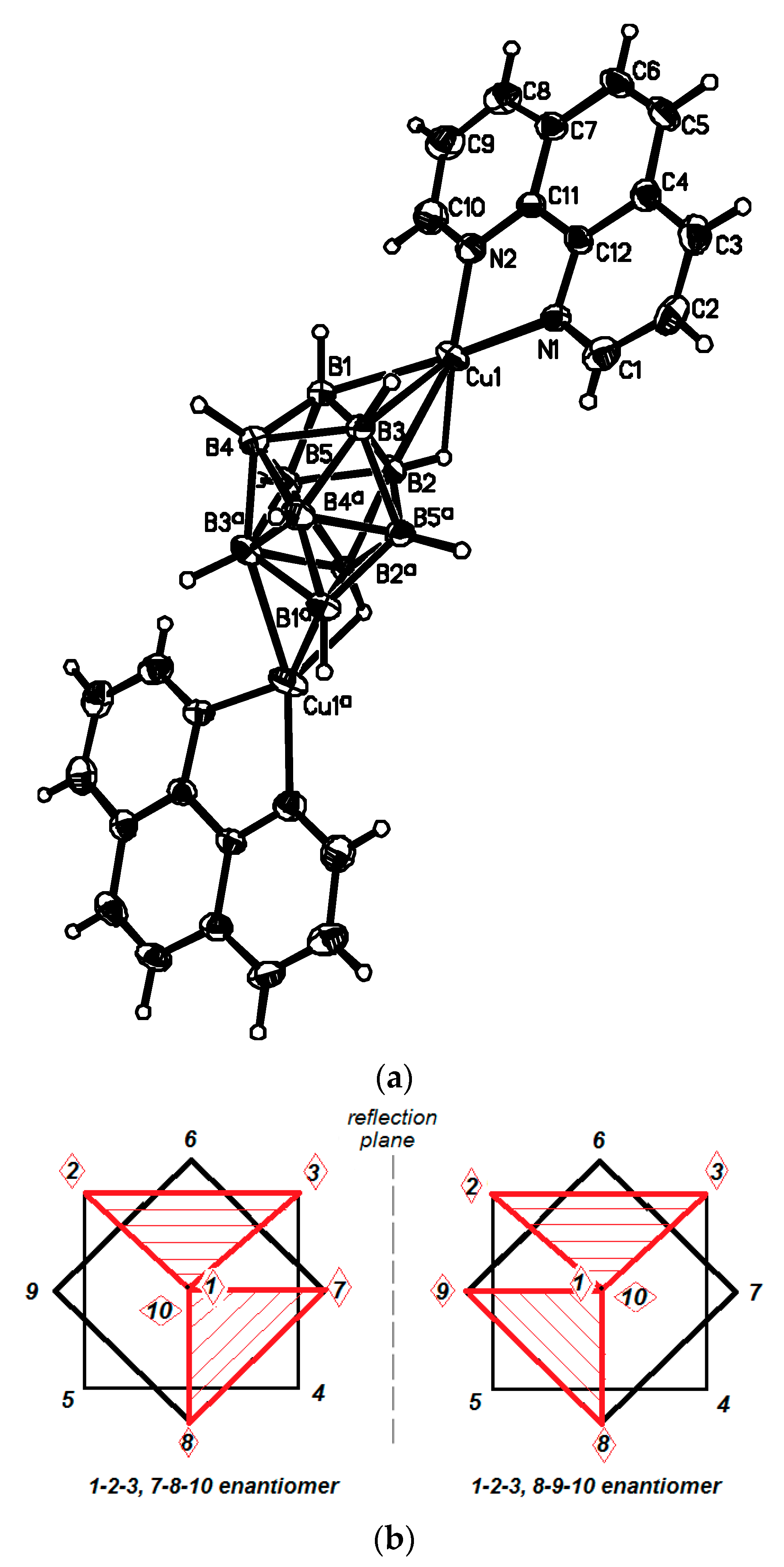 Structures of {((Phen)Cu)2[B10H10]} (a) and schematic representation of the cocristallized enantiomers (b). Reproduced with permission from reference [14]. Copyright © (2016) Elsevier.