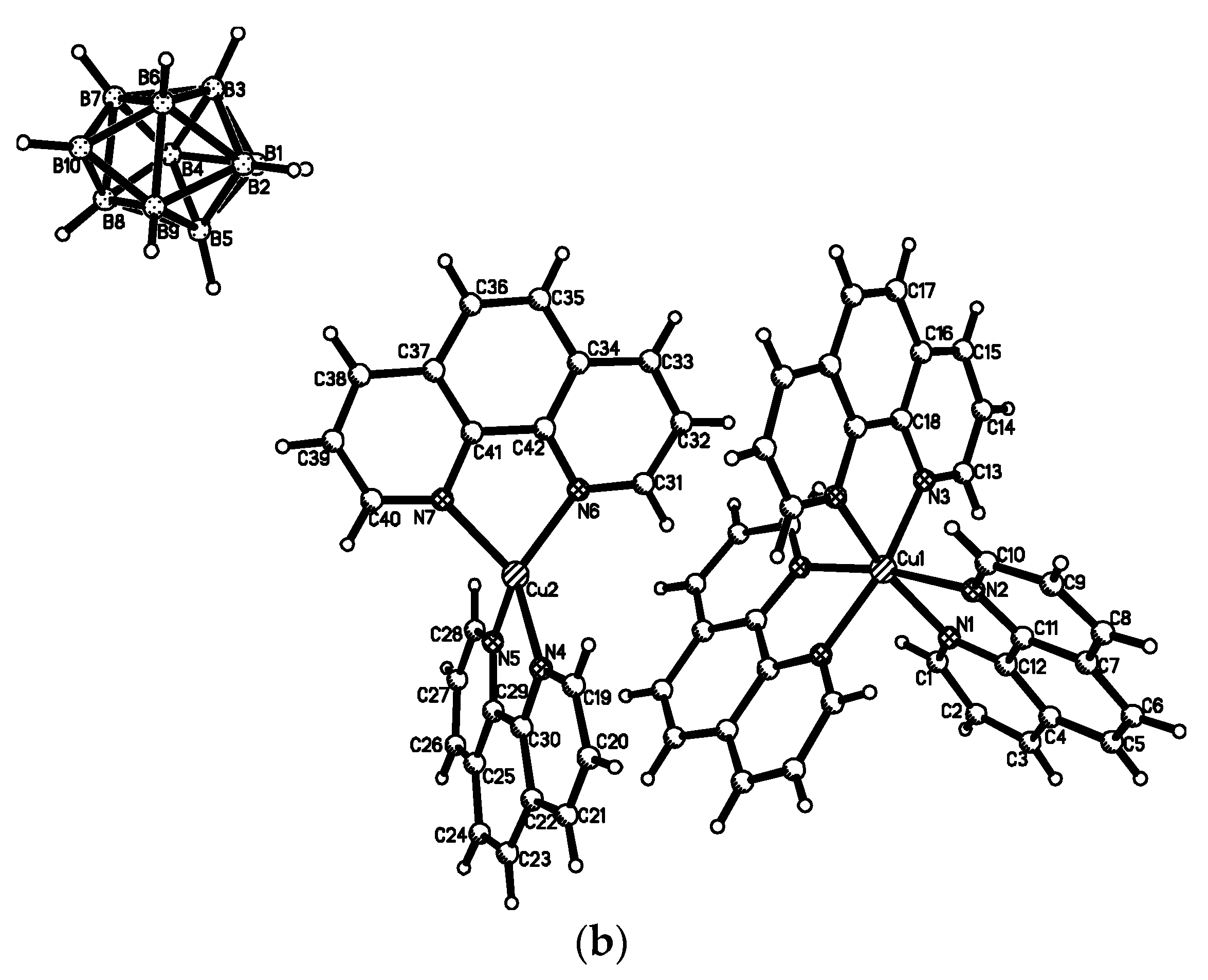 X-ray crystal structures of [CuI(Phen)2]2[B10H10]·MeCN (a) and [CuI(Phen)2]2[CuII(Phen)3][B10H10]2 (b). Reproduced with permission from reference [43]. Copyright © (2015) Elsevier.