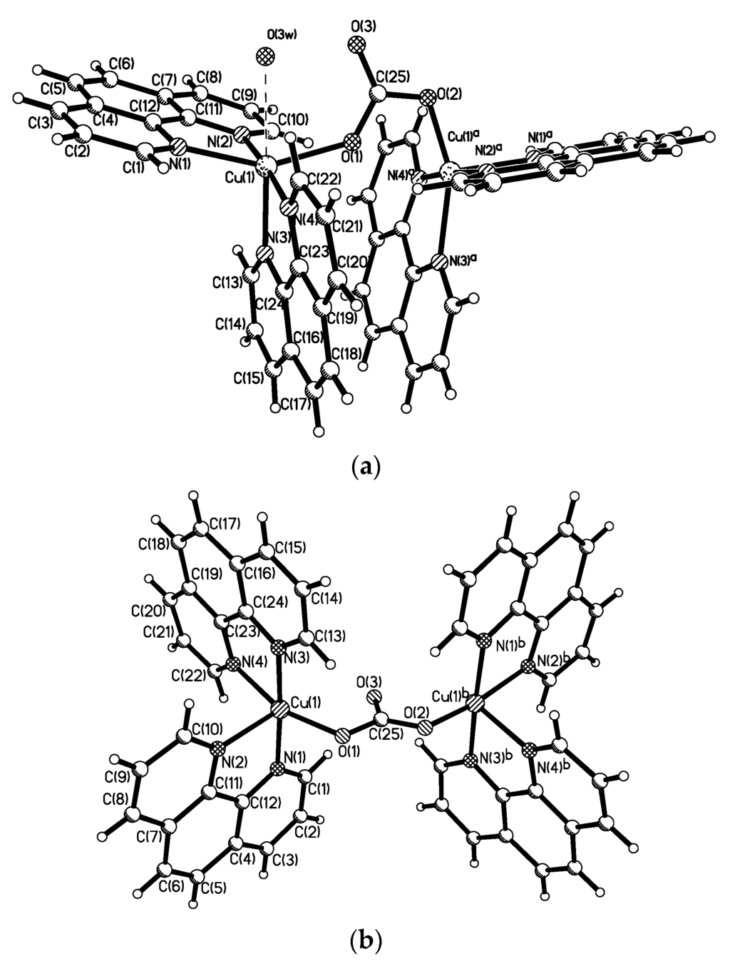 Structure of the [(Phen)2Cu(µ-CO3)Cu(Phen)2]2+ cations in complexes anti,syn-[Cu2(Phen)4(μ-CO3)][B10H10]·2.5(DMSO)·2(H2O) (a) and anti,anti-[Cu2(Phen)4(μ-CO3)][B10H10] ·4(DMF) (b). Reproduced with permission from reference [14]. Copyright © (2016) Elsevier.