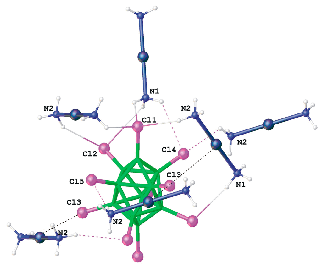 - Kravchenko, E.A.; Gippius, A.A.; Korlyukov, A.A.; Vologzhanina, A.V.; Avdeeva, V.V.; Malinina, E.A.; Ulitin, E.O.; Kuznetsov, N.T. Secondary interactions in decachloro-closo-decaborates R2[B10Cl10] (R = Et3NH+, Ph4P+, and [Ag(NH3)2]+): 35Cl NQR, PW-DFT, and X-ray studies. Inorg. Chim. Acta 2016, 447, 22–31. [Google Scholar] [CrossRef]