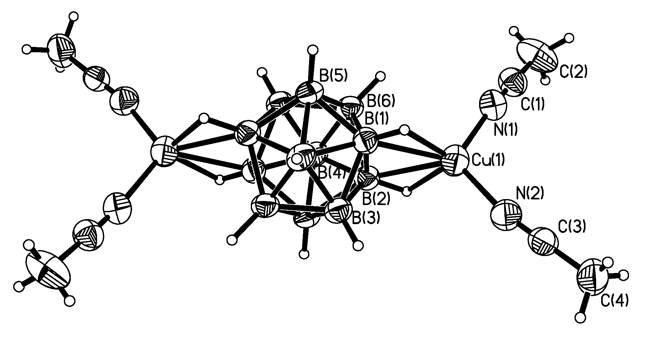 The X-ray structure of complex {((MeCN)2Cu)2[B10H10]}.