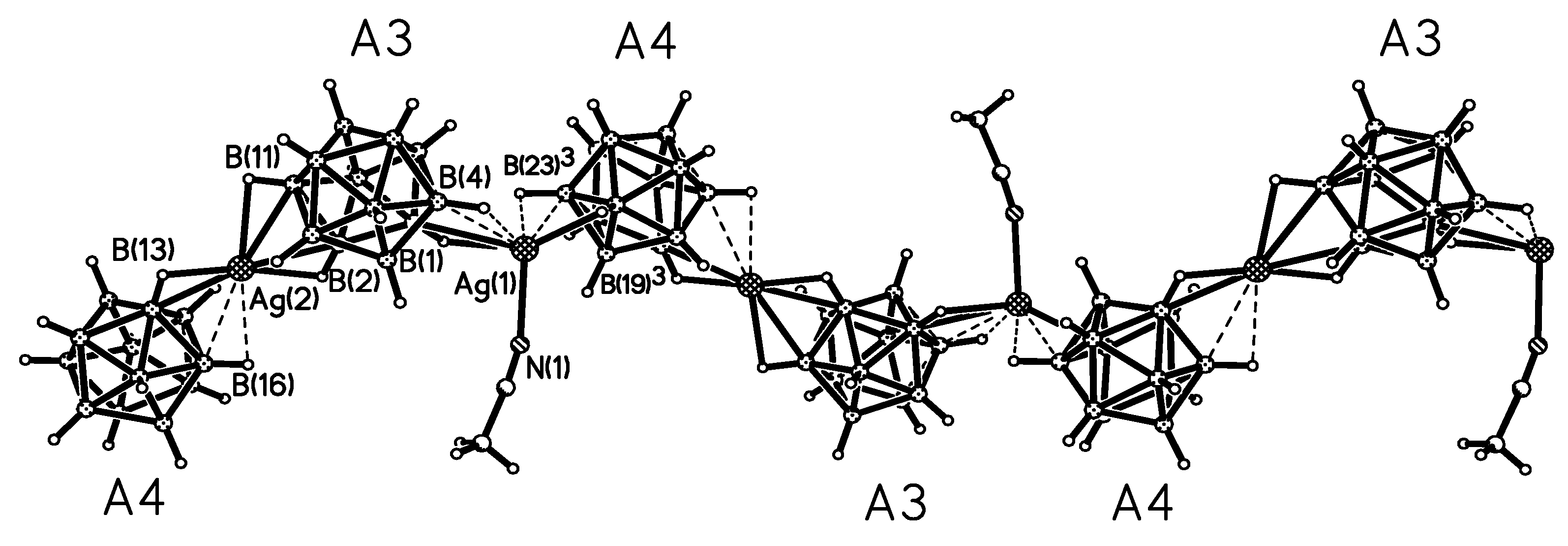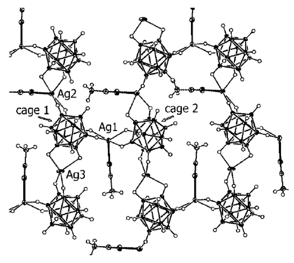 Fragment of X-ray structure of {[Cu(MeCN)3](Ag[B10H10])}n.
