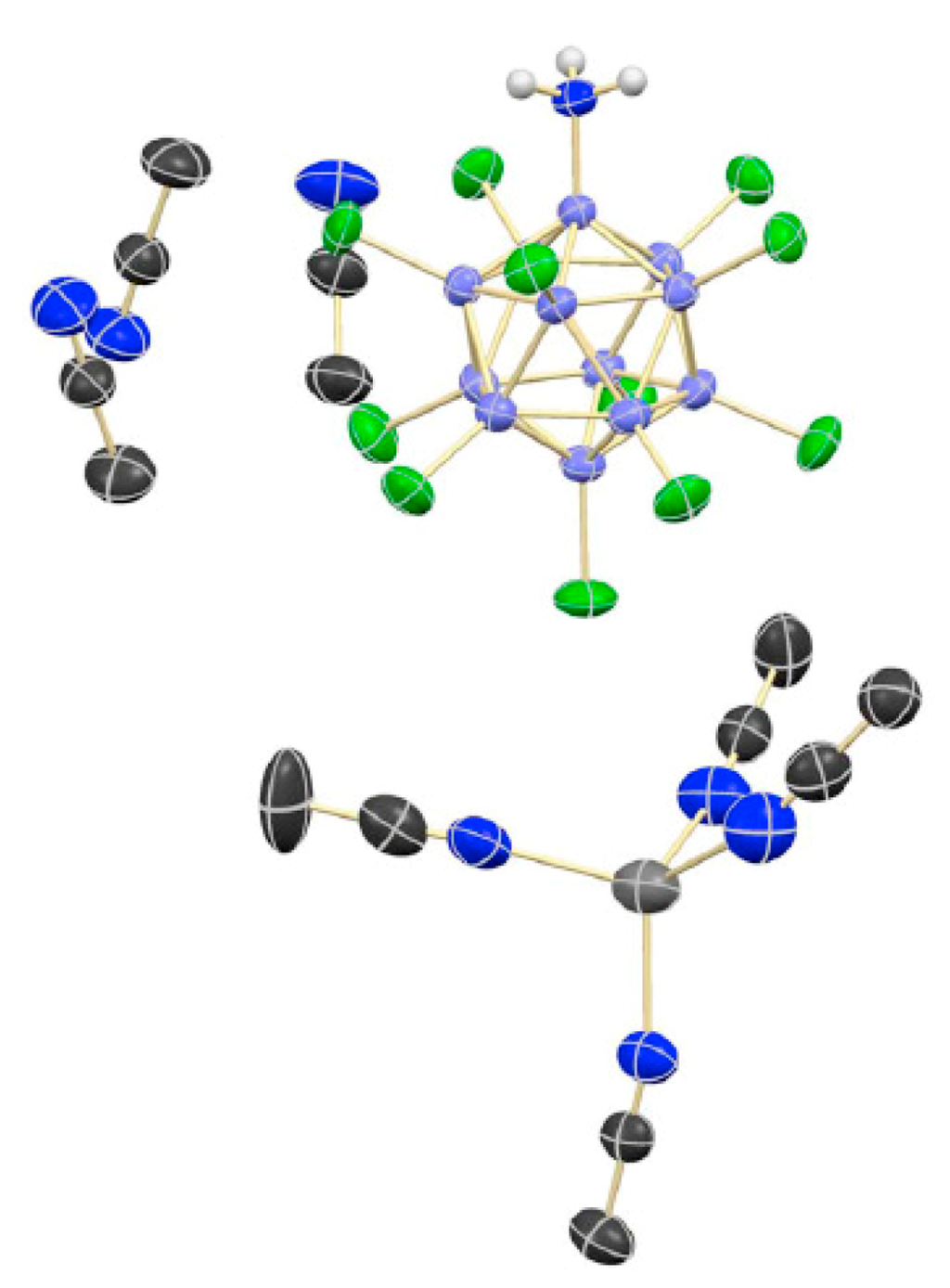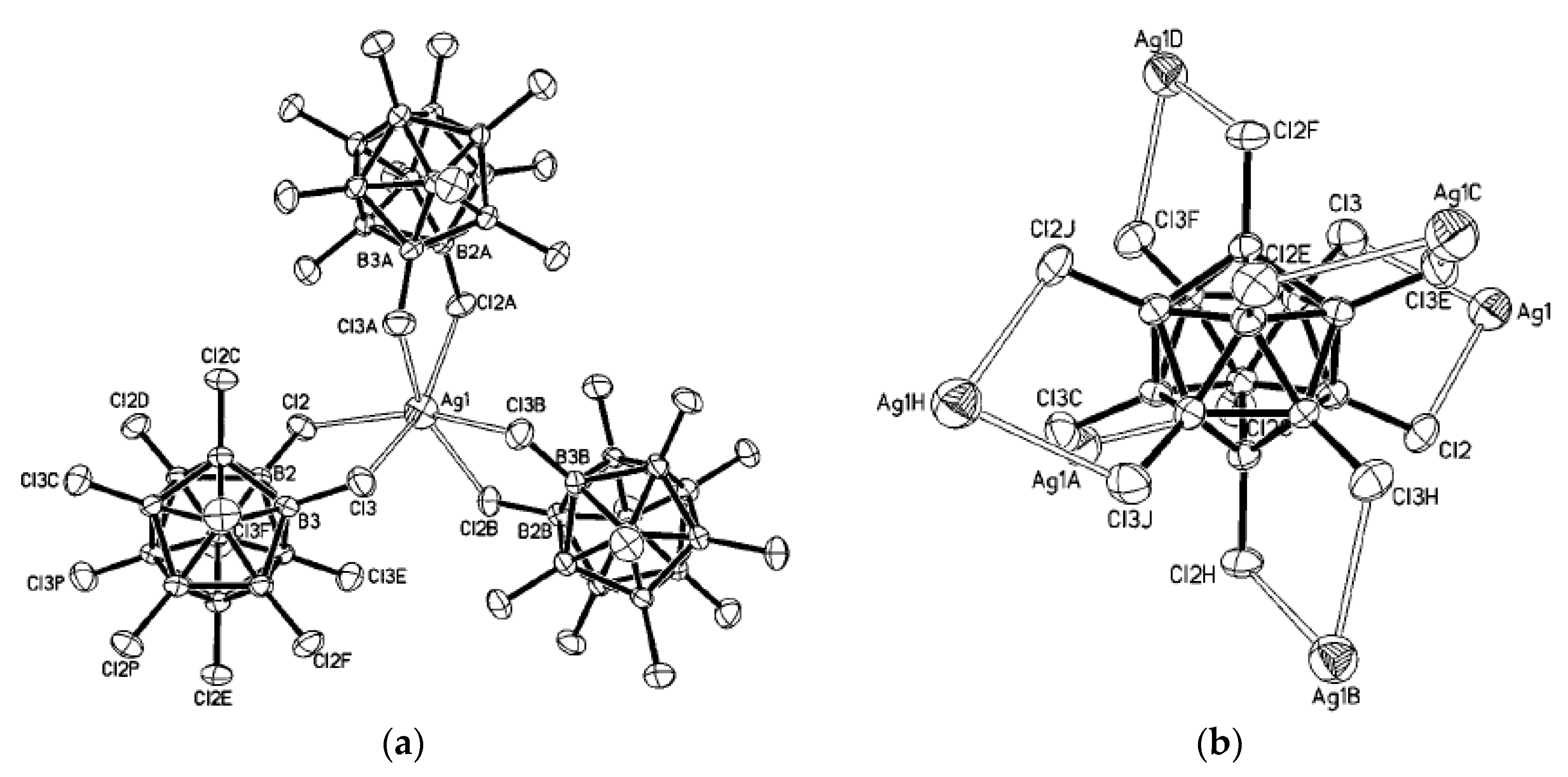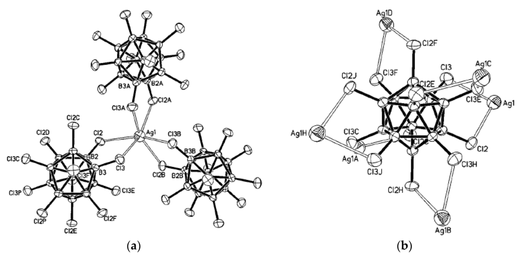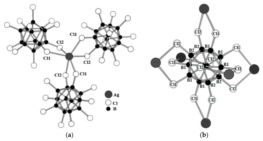- Tiritiris, I.; Schleid, T. The crystal structure of solvent-free silver dodecachloro-closo-dodecaborate Ag2[B12Cl12] from aqueous solution. Z. Anorg. Allg. Chem. 2003, 629, 581–583. [Google Scholar] [CrossRef]