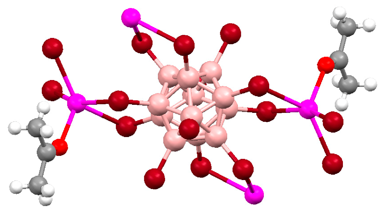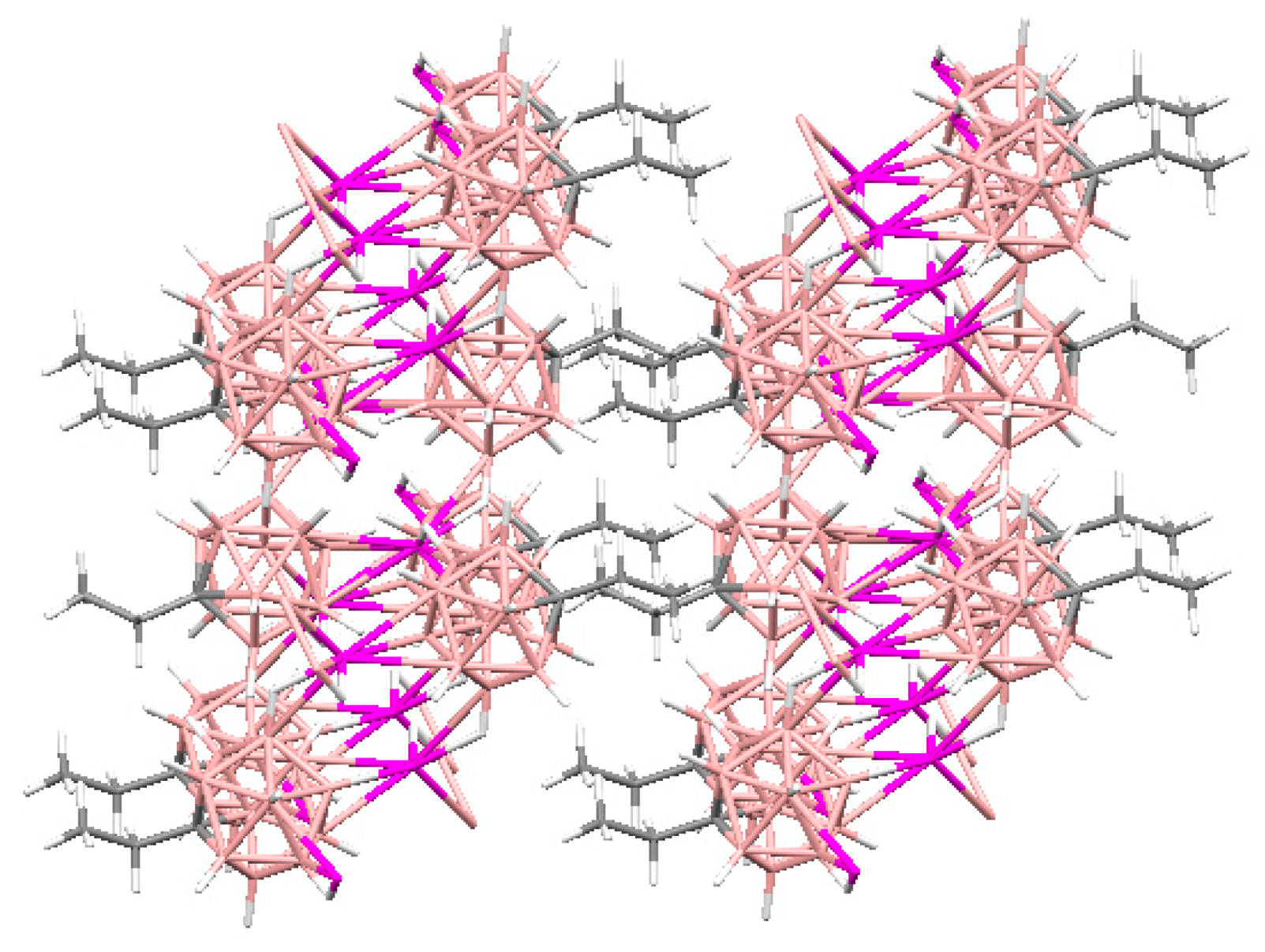 - Polyakova, I.N.; Malinina, E.A.; Drozdova, V.V.; Kuznetsov, N.T. Crystal structure of (μ5-decahydro-closo-decaborato) (μ2-O-dimethylformamide)disilver(I) [Ag2(B10H10)(DMF)]. Crystallogr. Rep. 2008, 53, 253–256. [Google Scholar] [CrossRef]