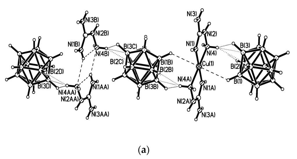 - Polyakova, I.; Malinina, E.A.; Drozdova, V.V.; Kuznetsov, N.T. The isomorphous substitution of 2H+ for the Cu2+ cation in the complex of bis(aminoguanidine)copper(II): Crystal structures of (Cu0.61H0.78 Agu 2)B12H12 and (HAgu)2B12H12. Crystallogr. Rep. 2009, 54, 831–836. [Google Scholar] [CrossRef]