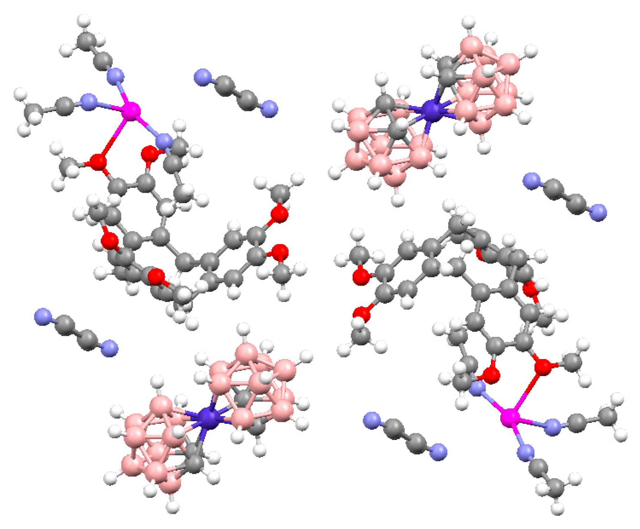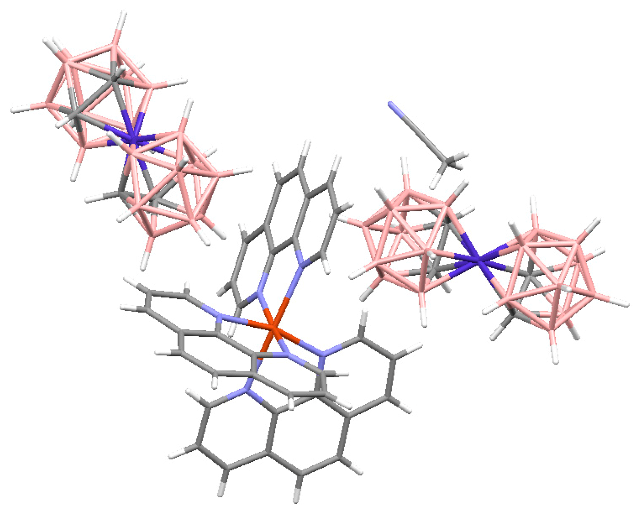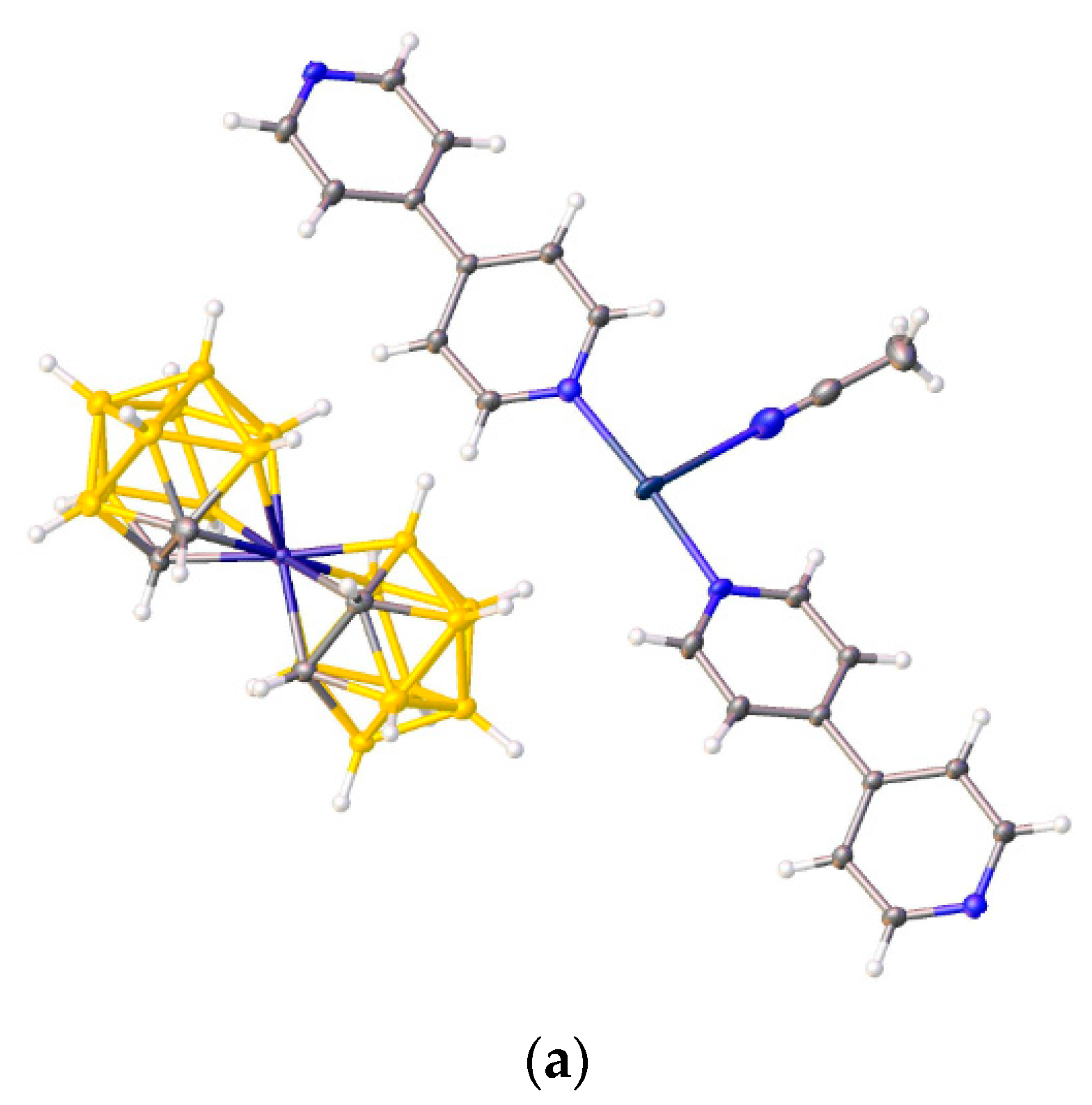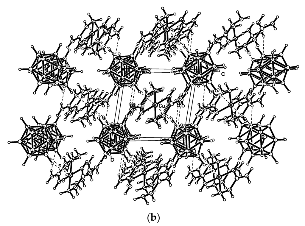 - Polyanskaya, T.M.; Volkov, V.V.; Drozdova, M.K. Crystal structure of [tris(1,10-phenanthroline)copper(II)(2+) bis{3,3′-commo-bis-[η5–1,2-Dicarba-(3)-cobalt(III)-closo- dodecaborate]}(1-)-diacetonitrile, [CuII(1,10-C12H8N2)3]2+{CoIII[η5-(3)-1,2-C2B9H11]2}2−·2CH3CN. J. Struct. Chem. 2003, 44, 632–641. [Google Scholar] [CrossRef]