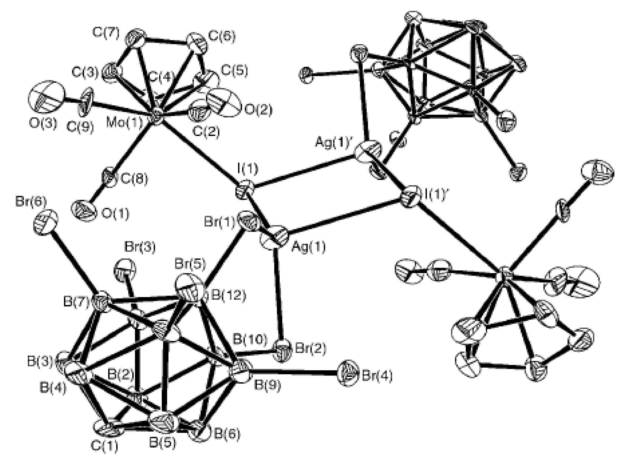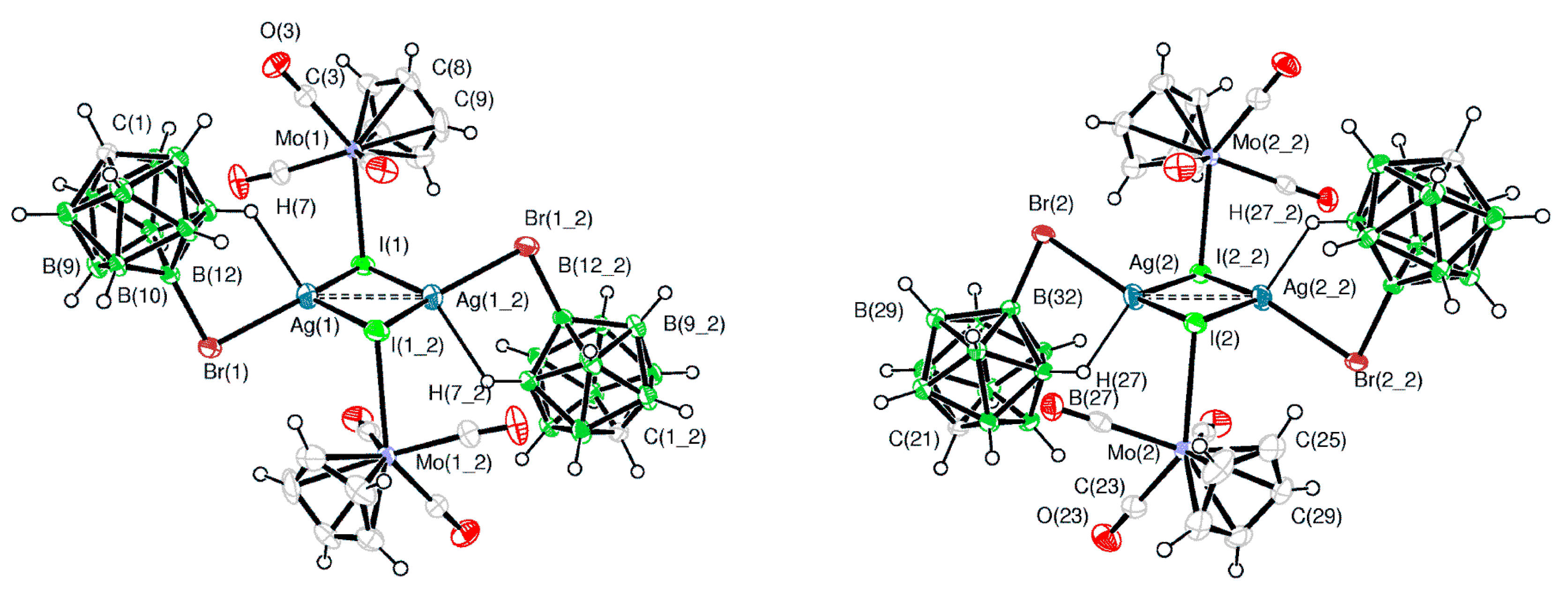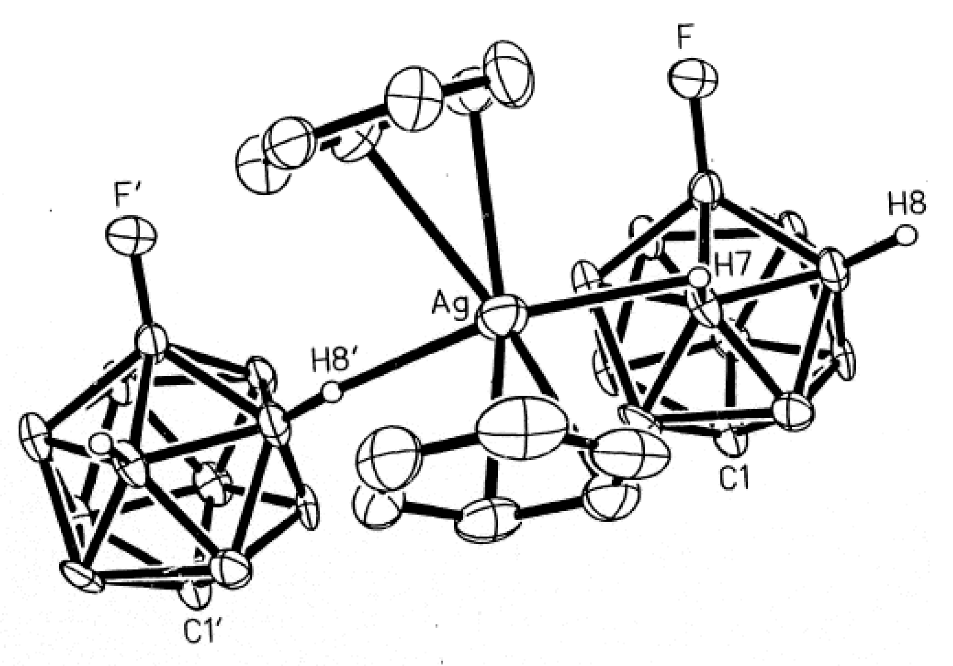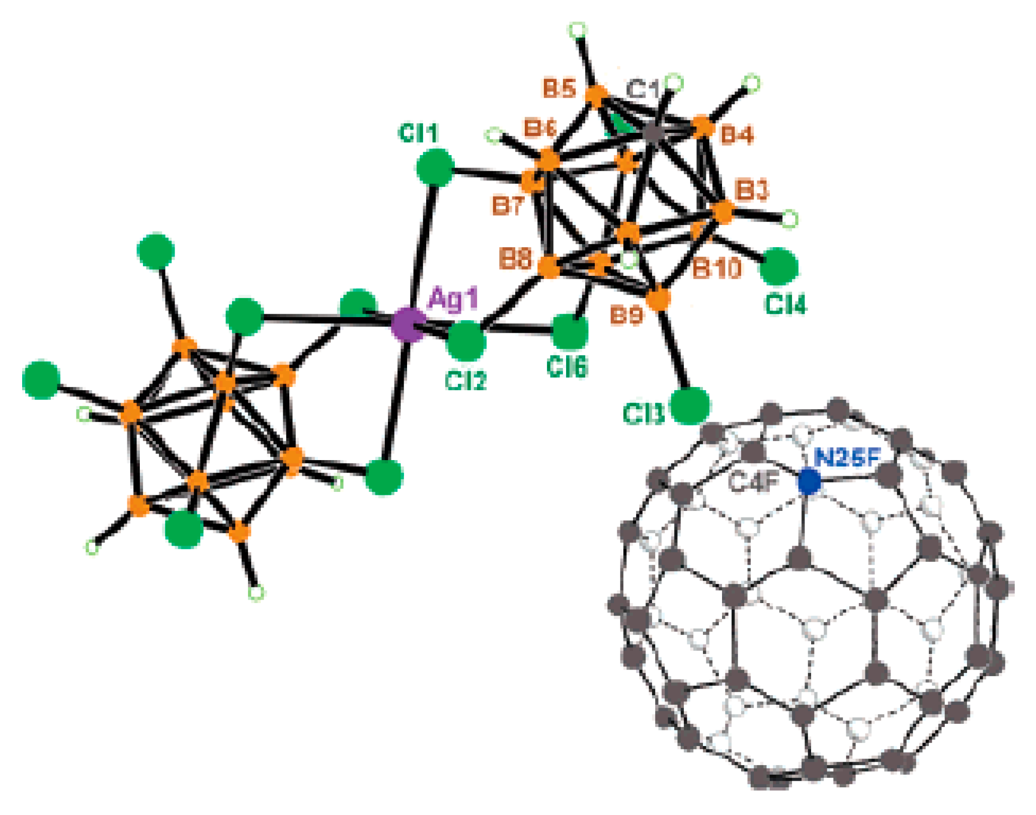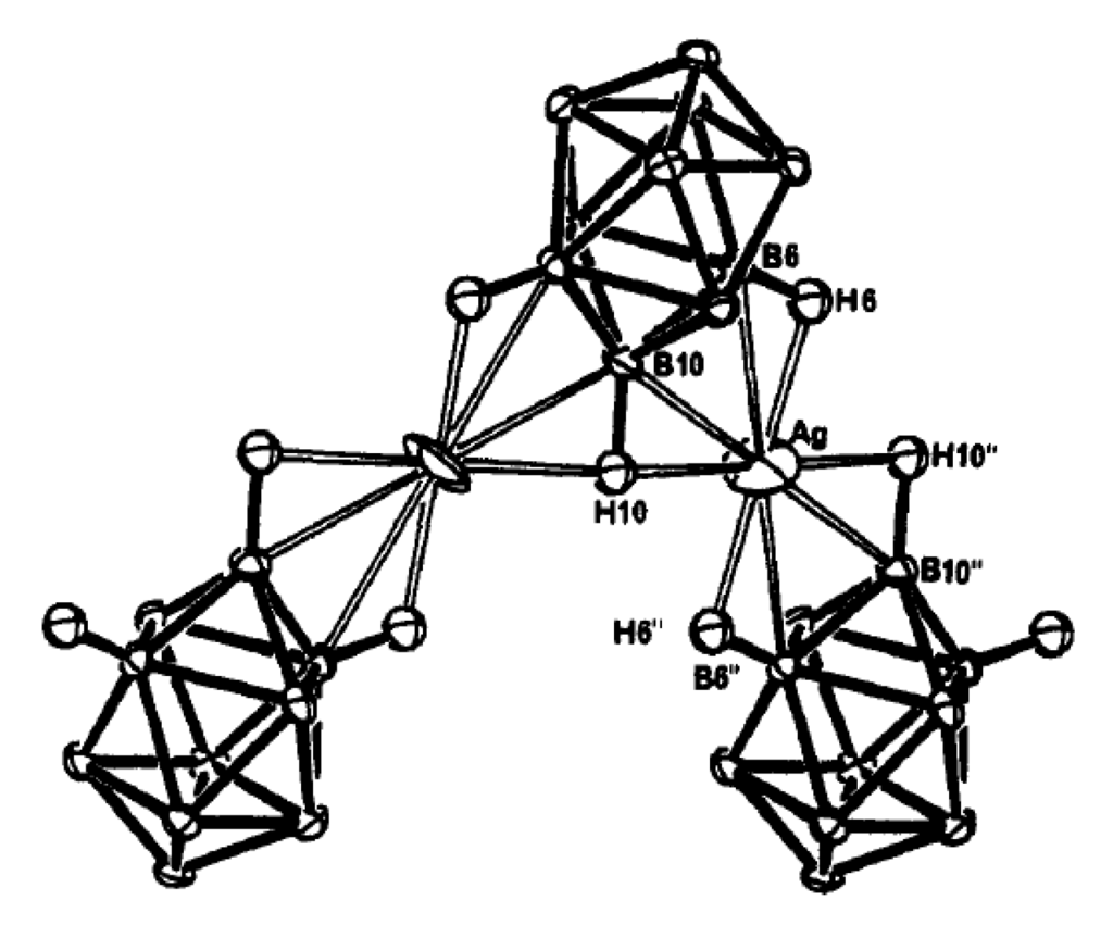 The X-ray structure of {[(MeCN)3Ag](Ag[2-B10H9F])}2 (both positions of the disordered fluorine atom are shown). Reproduced with permission from reference [14]. Copyright © (2016) Elsevier.
