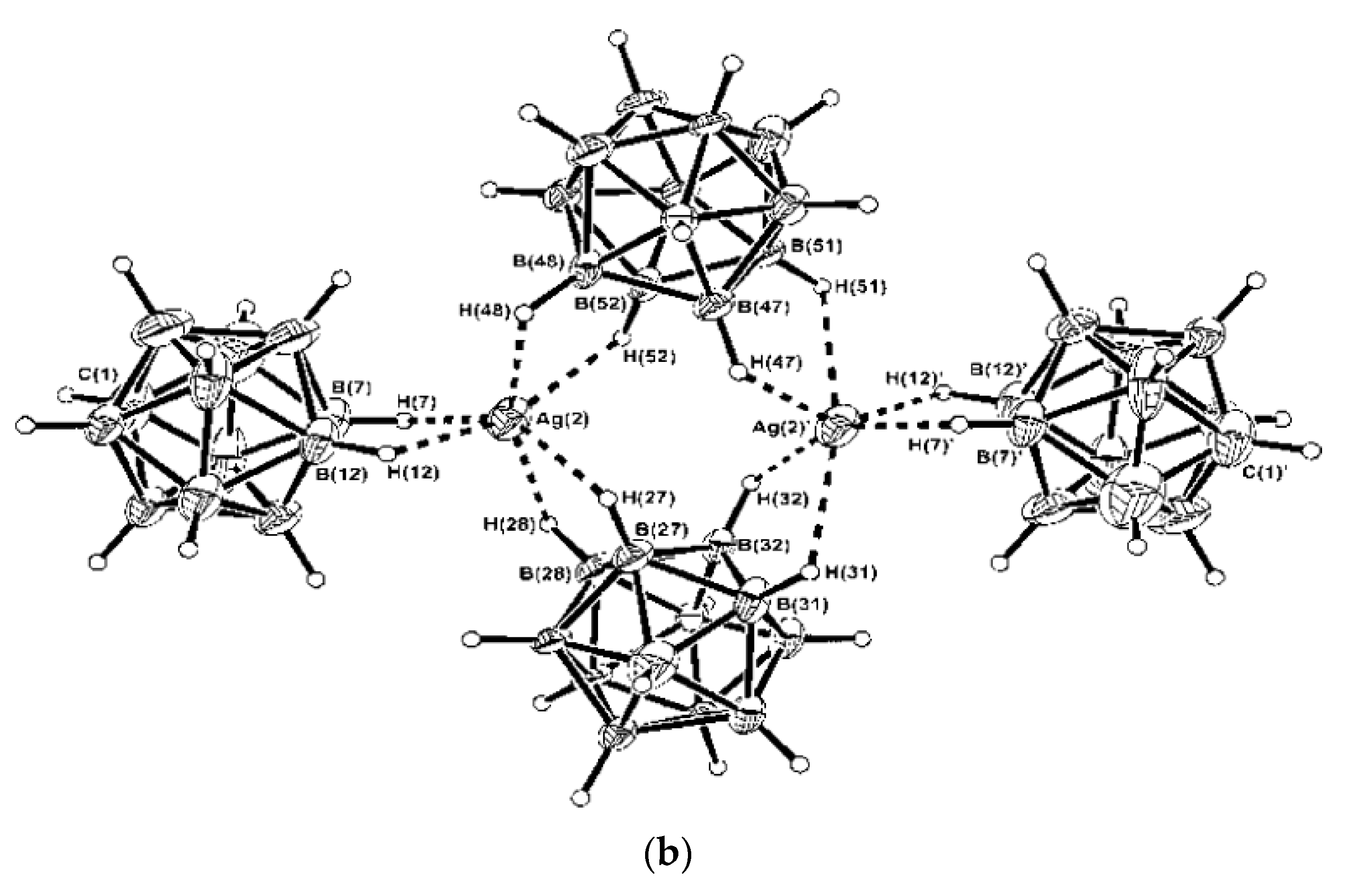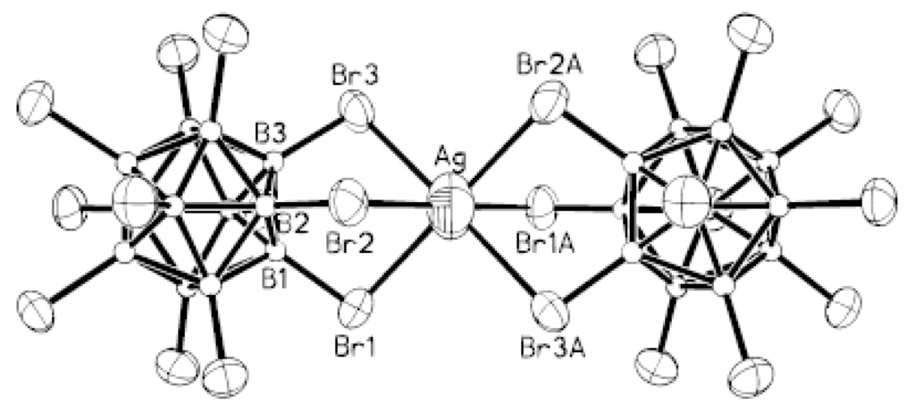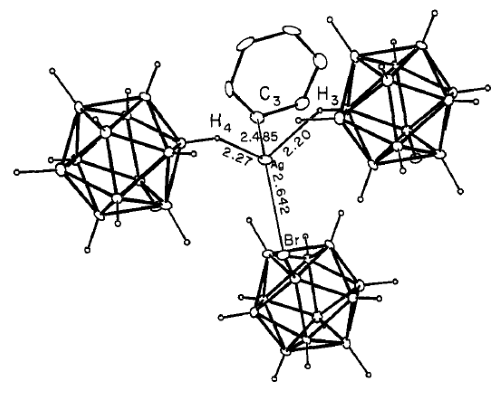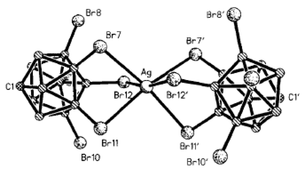 - Fox, M.A.; Mahon, M.F.; Patmore, N.J.; Weller, A.S. Solution and solid-state structure of the anion [Ag2{closo-CB11H12}4]2−. Inorg. Chem. 2002, 41, 4567–4573. [Google Scholar] [CrossRef] [PubMed]