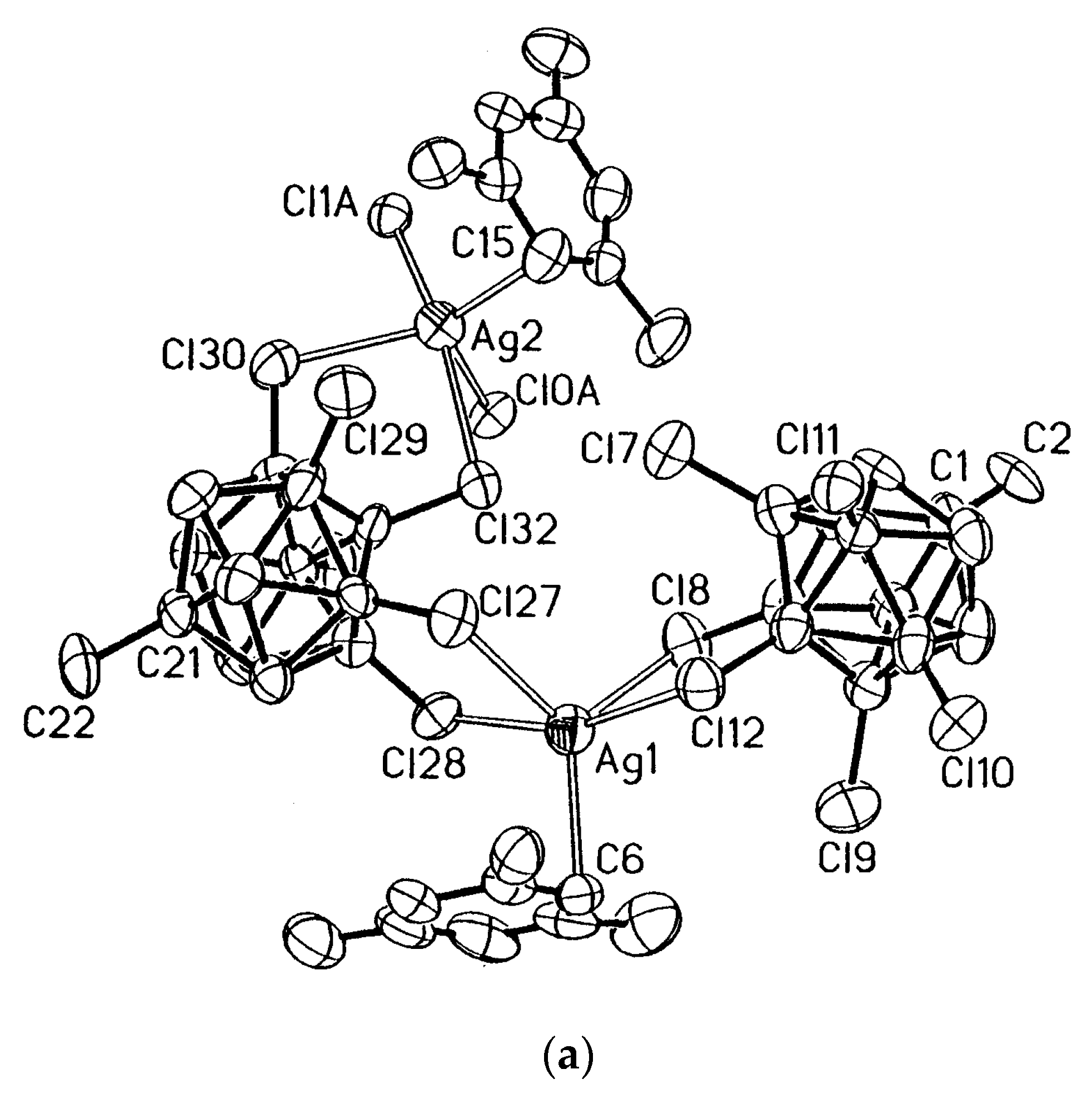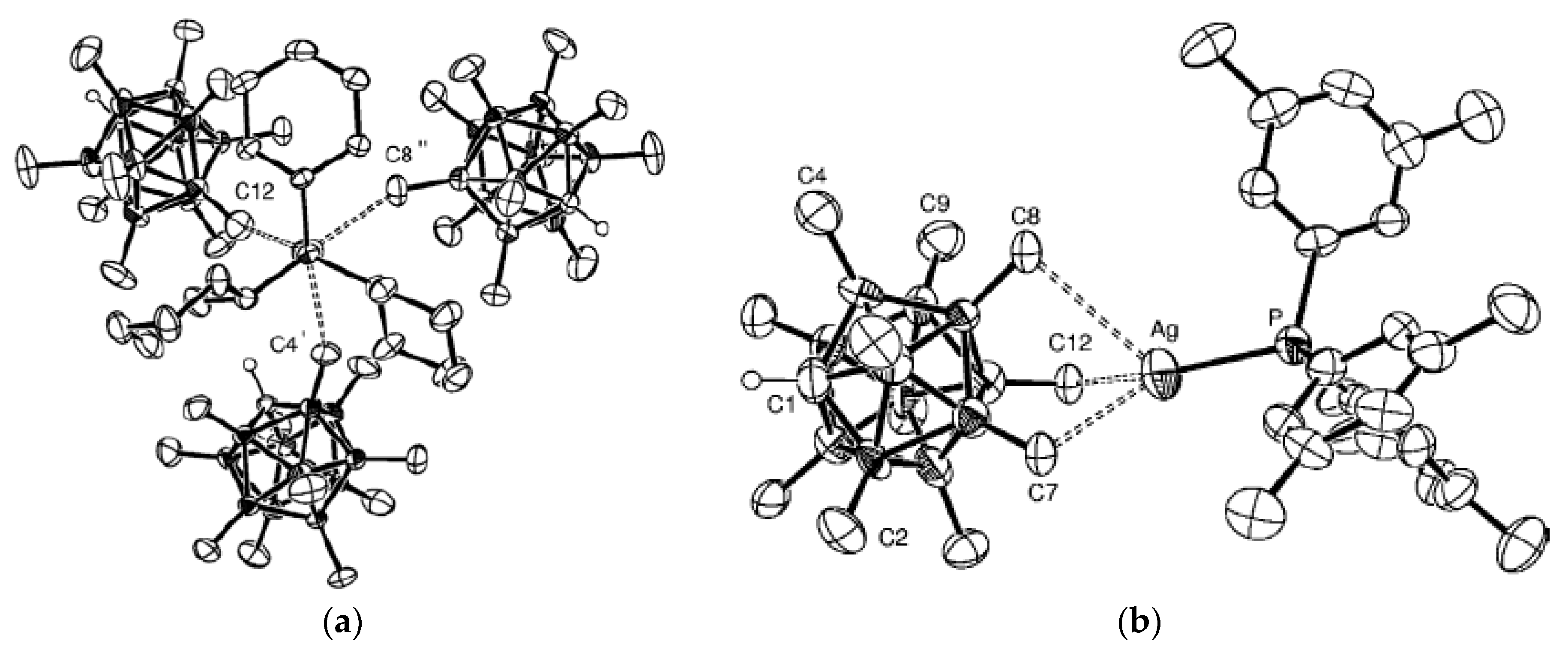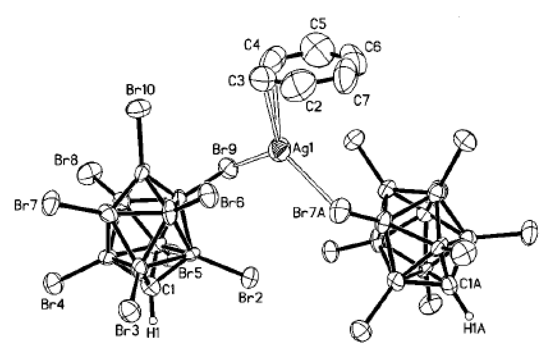 - Fox, M.A.; Mahon, M.F.; Patmore, N.J.; Weller, A.S. Solution and solid-state structure of the anion [Ag2{closo-CB11H12}4]2−. Inorg. Chem. 2002, 41, 4567–4573. [Google Scholar] [CrossRef] [PubMed]