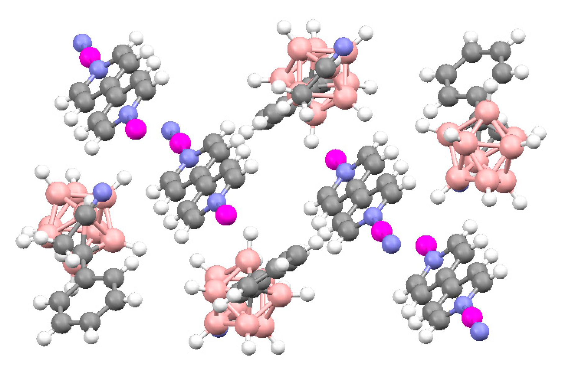 - Carr, M.J.; Franken, A.; Macias, R.; Kennedy, J.D. Twelve-vertex polyhedral carbaborane chemistry. Isostructural cations and anions: The “globule-globule” salt [H3NCH2C2B10H11] [H3CCH2CB11H11]. Polyhedron 2006, 25, 1069–1075. [Google Scholar] [CrossRef]