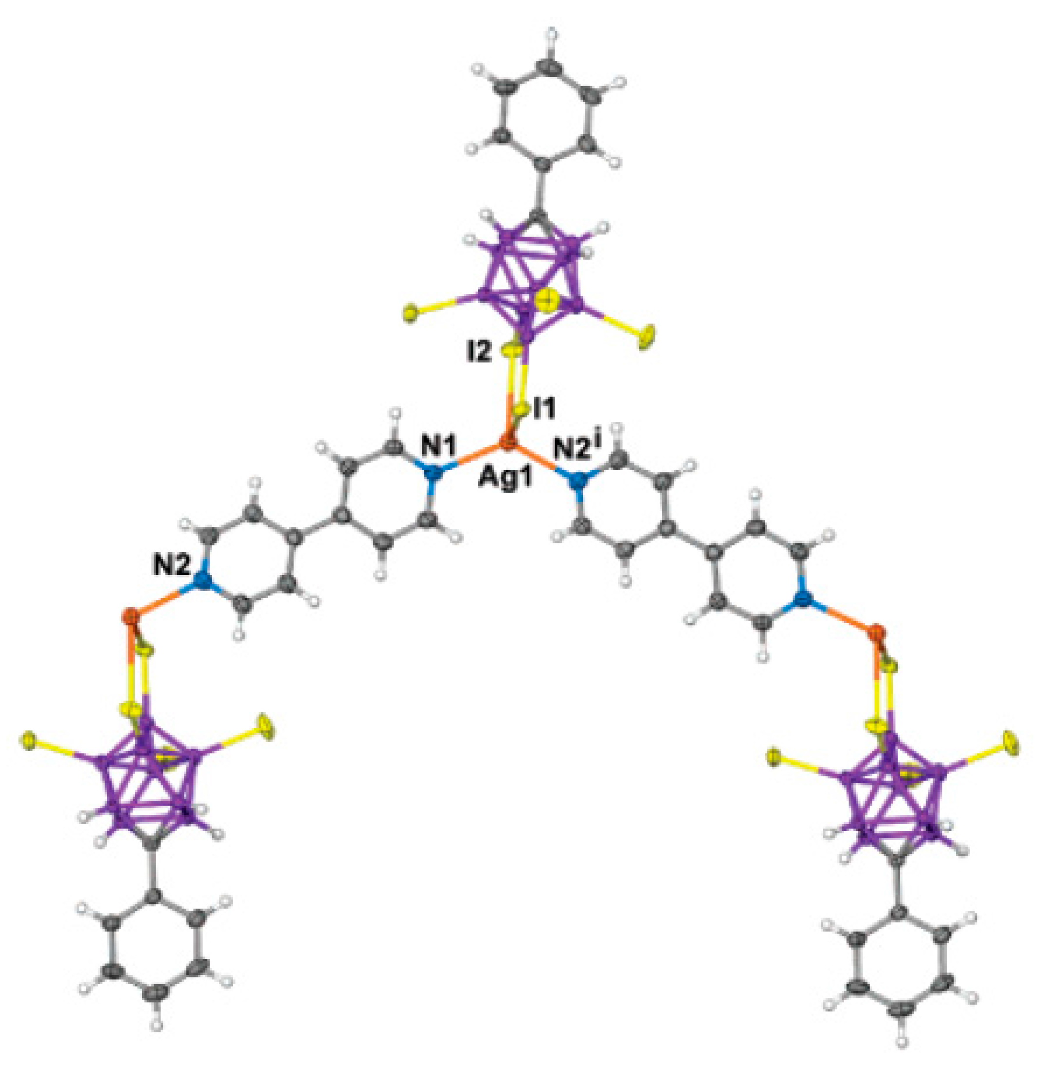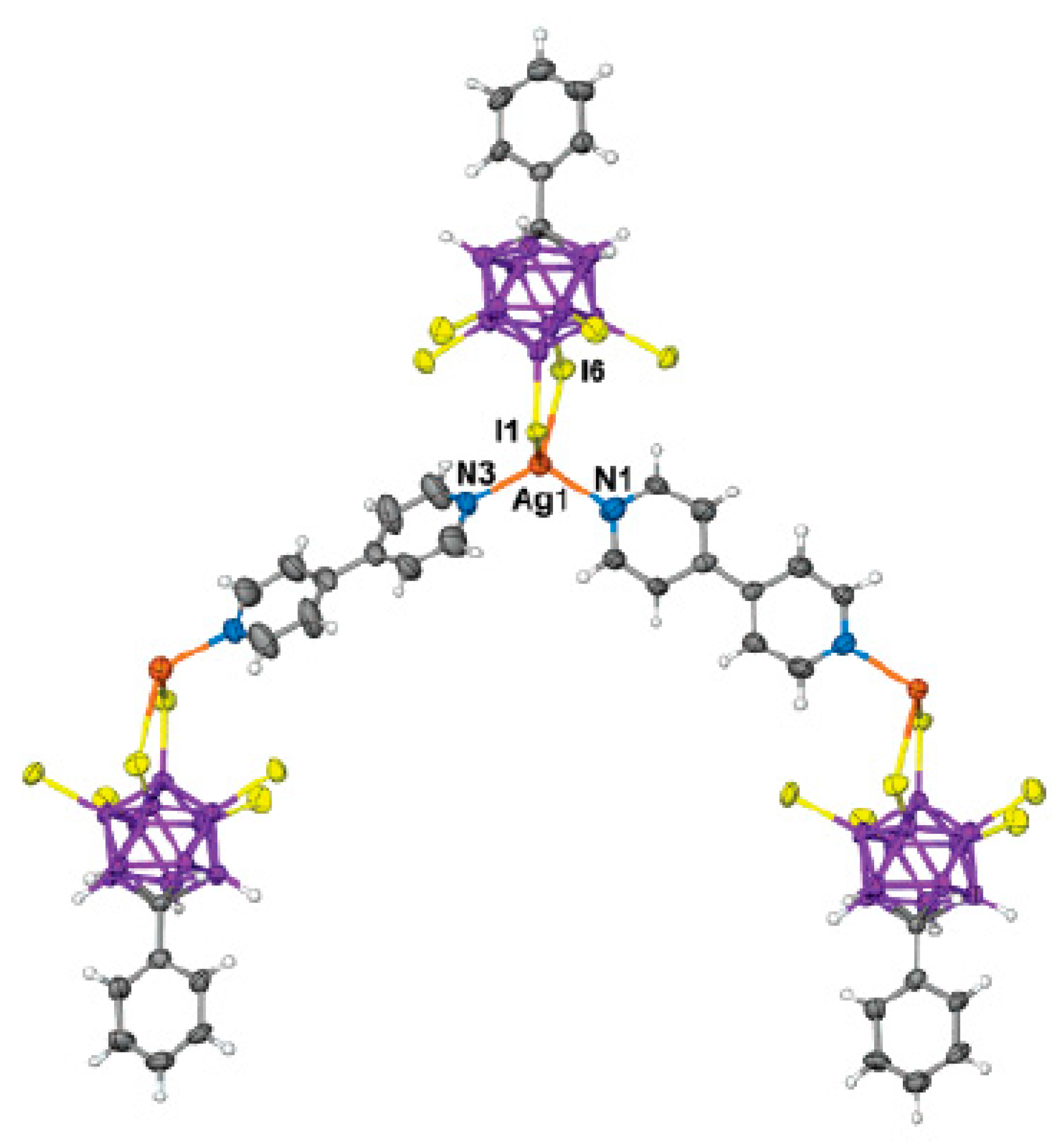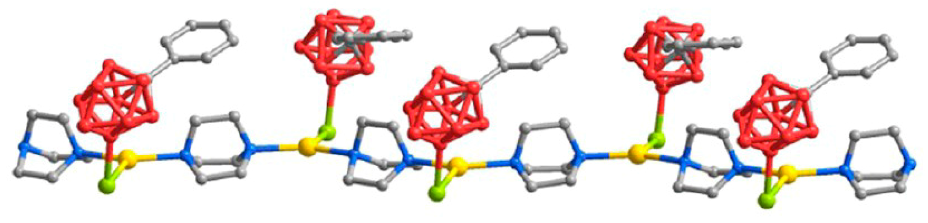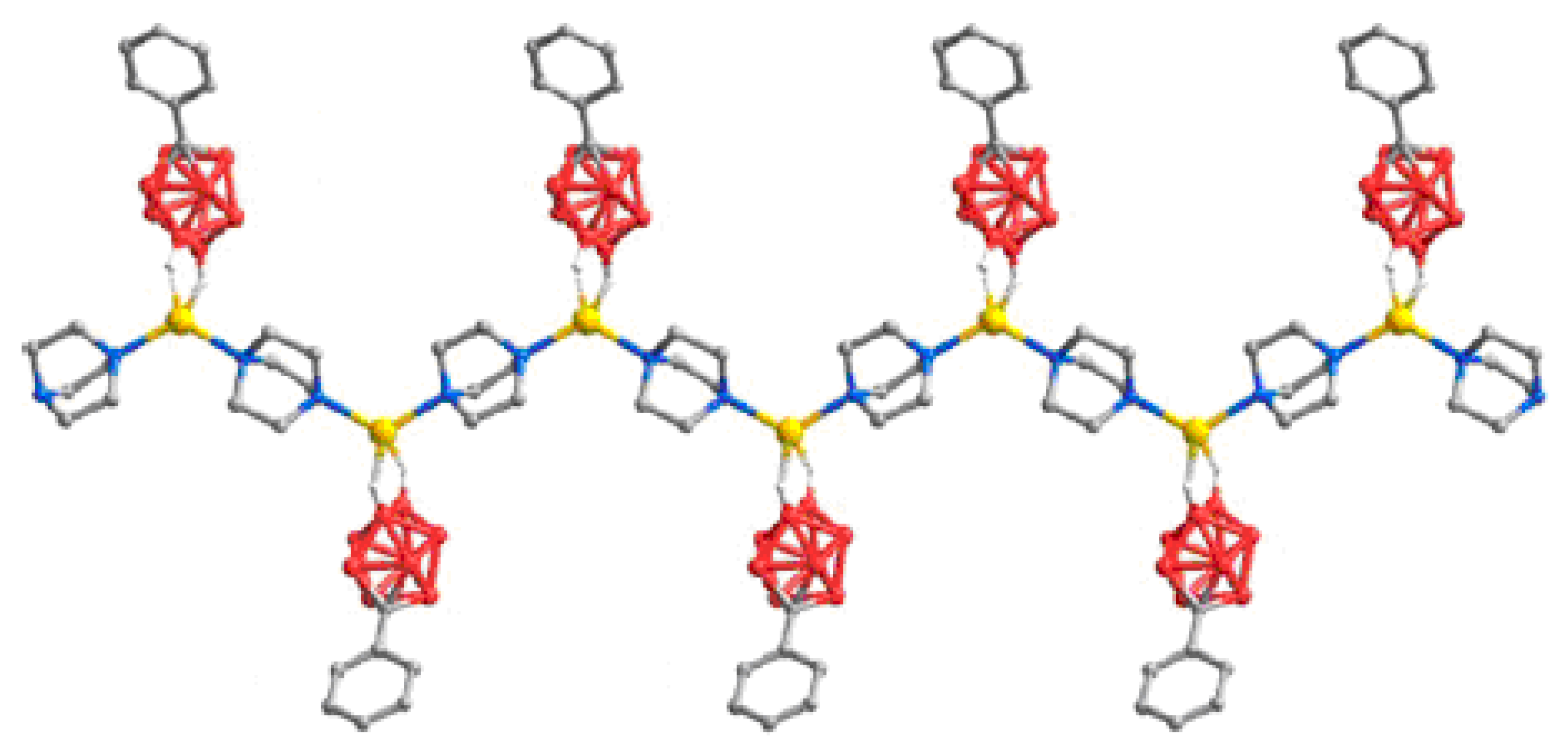 - Cunha-Silva, L.; Ahmad, R.; Carr, M.J.; Franken, A.; Kennedy, J.D.; Hardie, M.J. One-dimensional coordination polymers with phenyl-carbaborane anions: Ag(I)/4,4′-bipyridine and 2,3-bis-(2-pyridyl)pyrazine complexes. Cryst. Growth Des. 2007, 7, 658–667. [Google Scholar] [CrossRef]