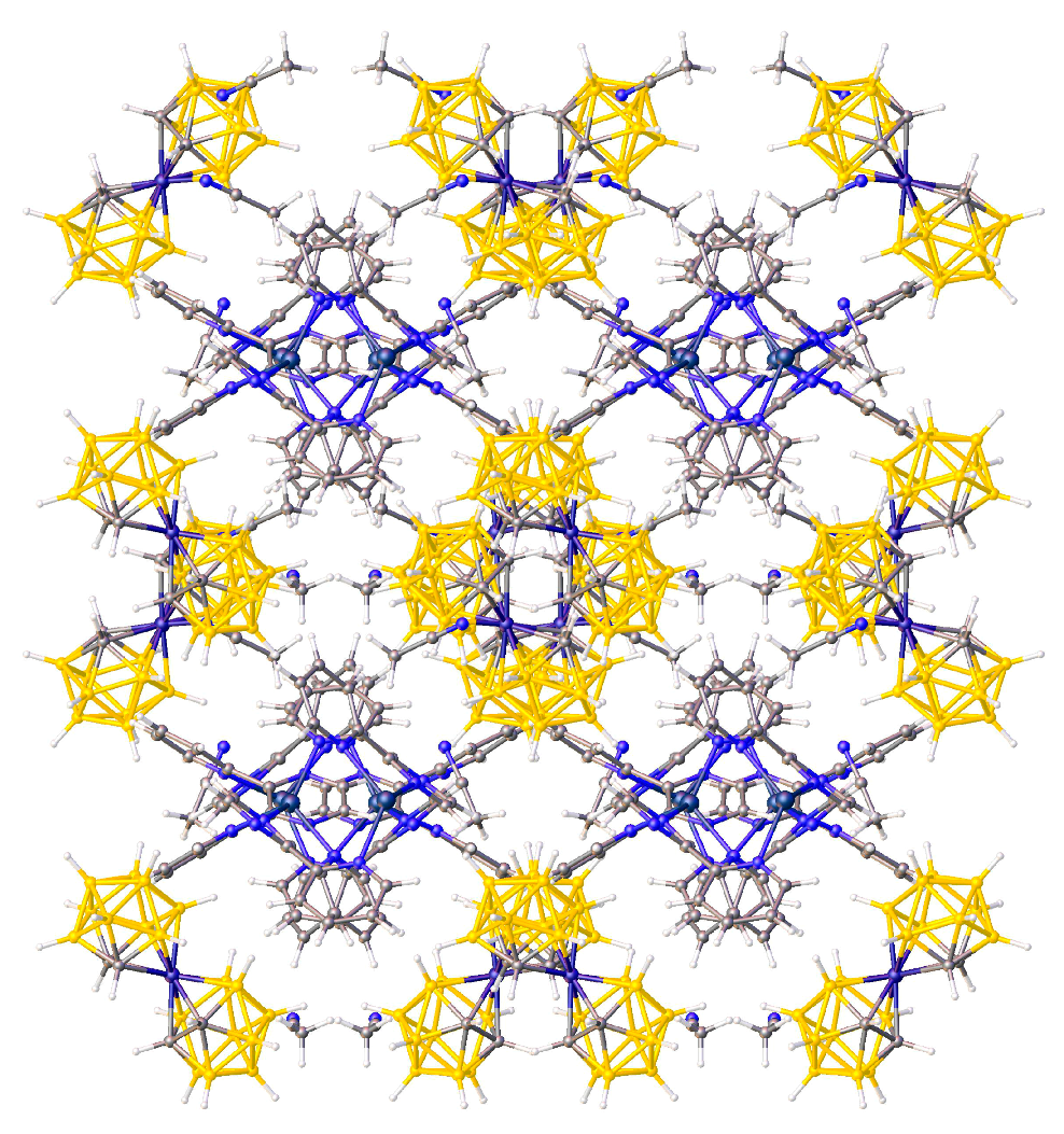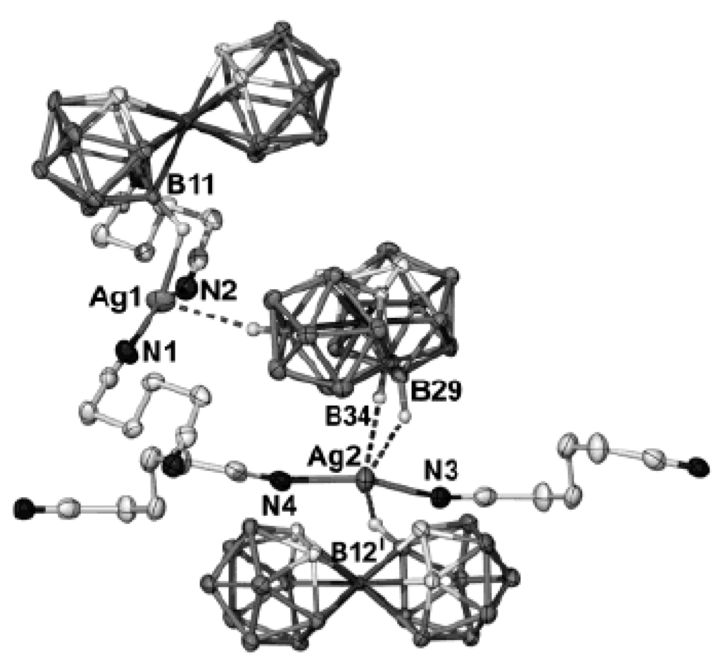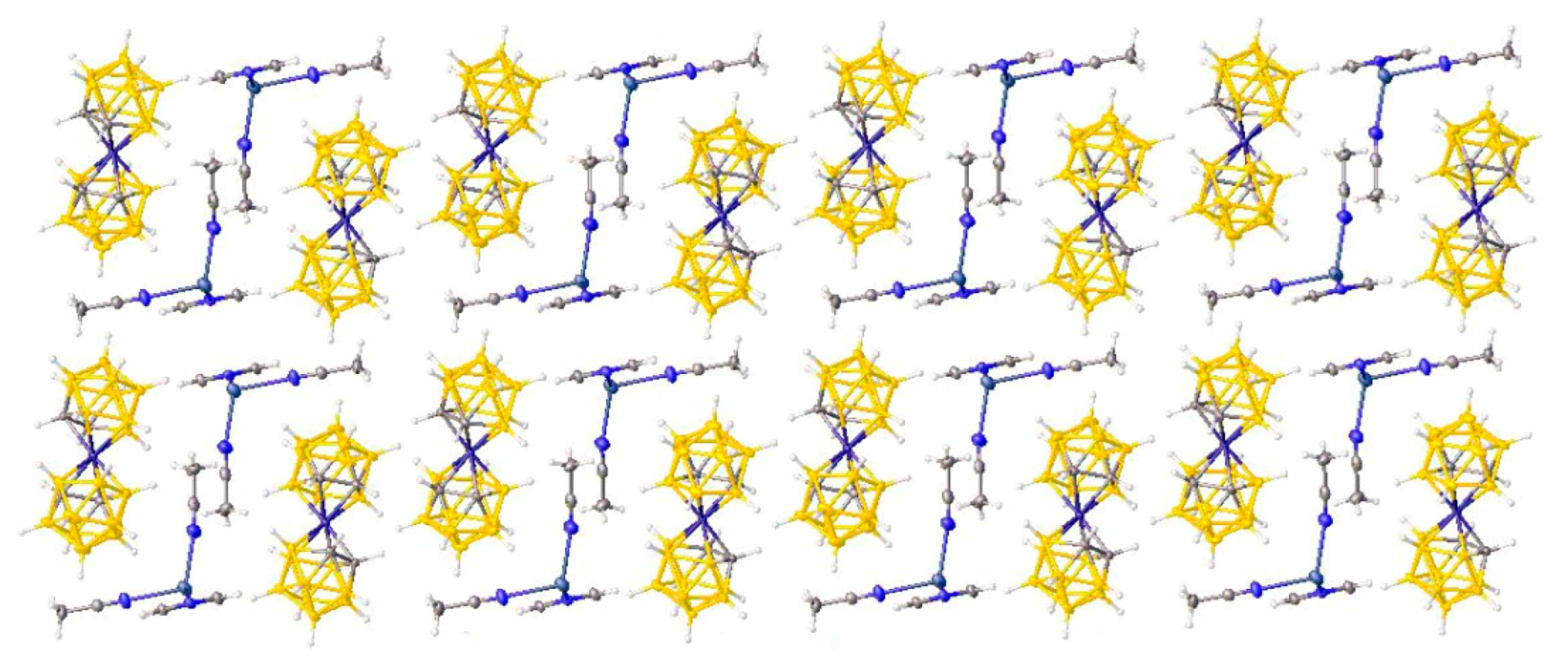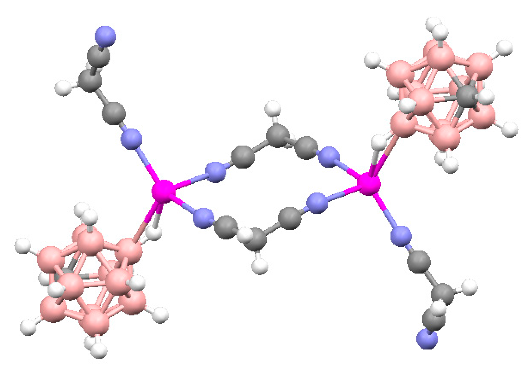 - Westcott, A.; Whitford, N.; Hardie, M.J. Coordination polymers with carborane anions: Silver dinitrile complexes. Inorg. Chem. 2004, 43, 3663–3672. [Google Scholar] [CrossRef] [PubMed]