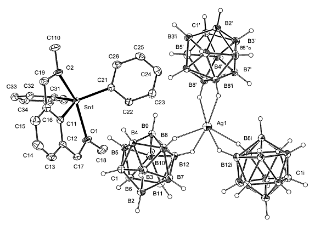- Kašna, B.; Jambor, R.; Dostal, L.; Cisařova, I.; Holeček, J.; Štibr, B. Stabilization of triaryltin(IV) cations an O,C,O-coordinating pincer-type ligand. Isolation of a new [Ag(1-CB11H12)3]2− anion. Organometallics 2006, 25, 5139–5144. [Google Scholar] [CrossRef]