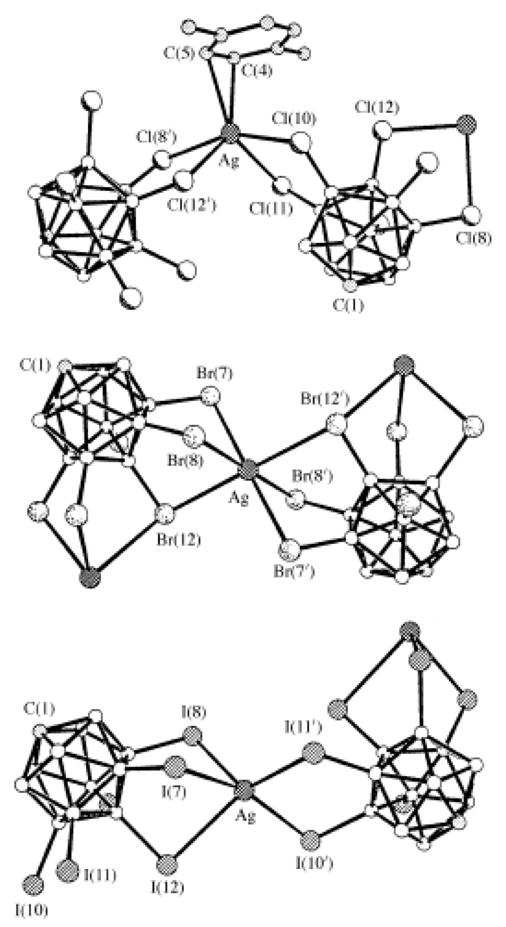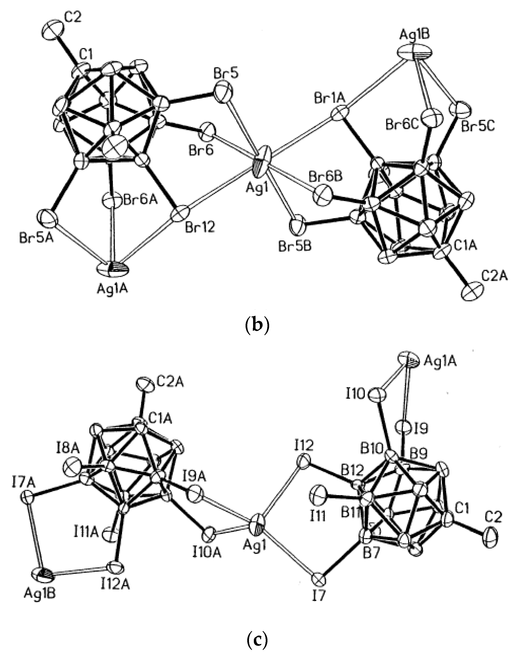 - Xie, Z.; Wu, B.-M.; Mak, T.C.W.; Manning, J.; Reed, C.A. Structural diversity in silver salts of hexahalogenocarborane anions, Ag(CB11H6X6) (X = Cl, Br or I). J. Chem. Soc. Dalton Trans. 1997, 1213–1217. [Google Scholar] [CrossRef]