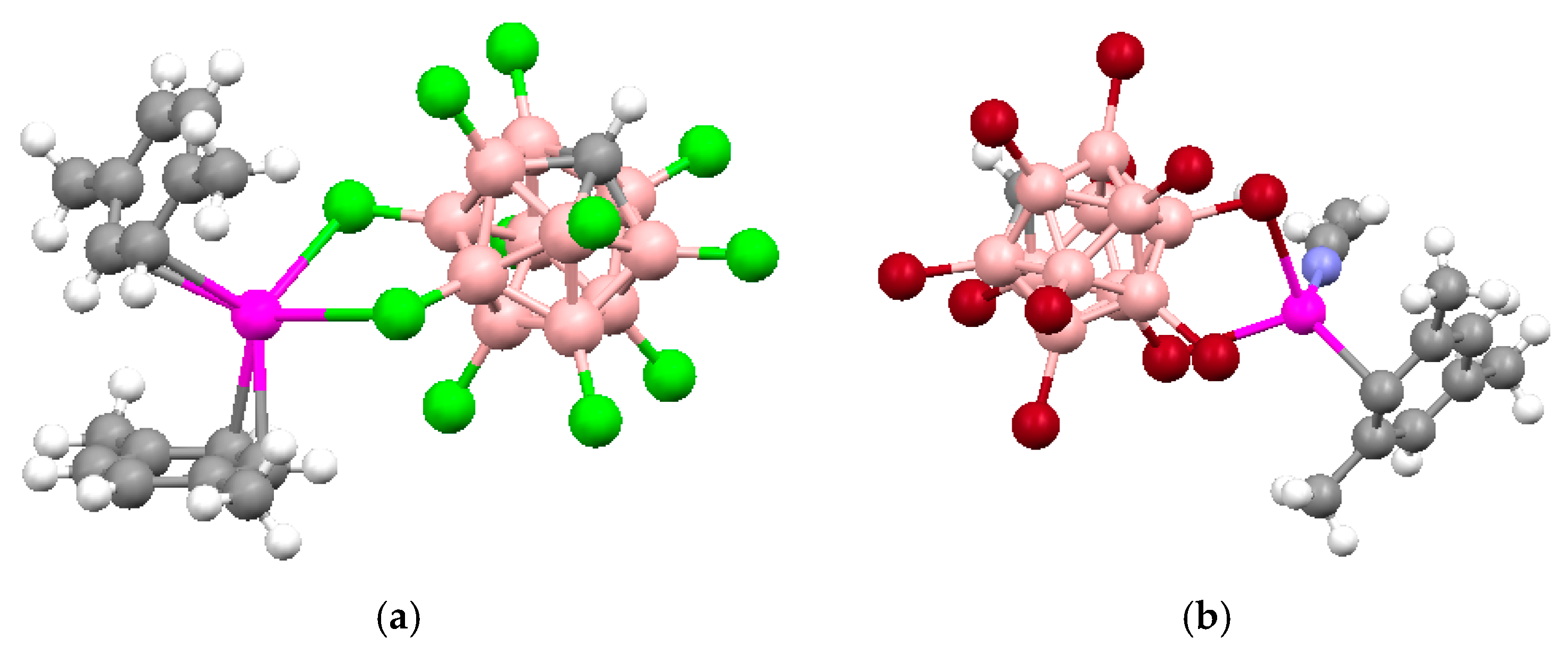 - Tsang, C.-W.; Yang, Q.; Sze, E.T.-P.; Mak, T.C.W.; Chan, D.T.W.; Xie, Z. Weakly coordinating nature of a carborane cage bearing different halogen atoms. Synthesis and structural characterization of icosahedral mixed halocarborane anions, 1-H-CB11Y5X6− (X, Y = Cl, Br, I). Inorg. Chem. 2000, 39, 5851–5858. [Google Scholar] [CrossRef] [PubMed]