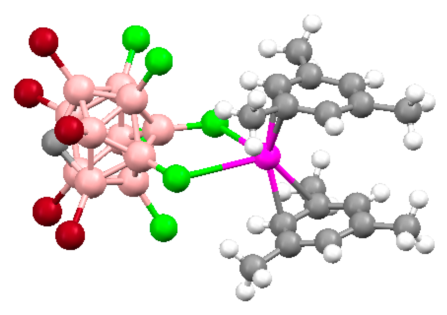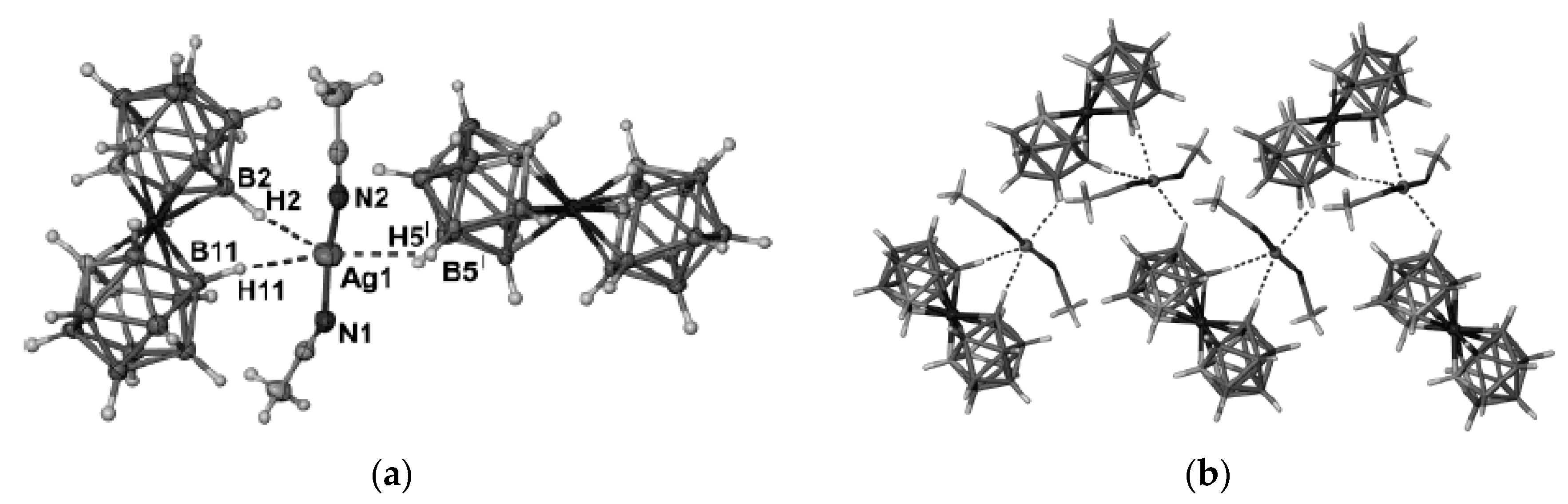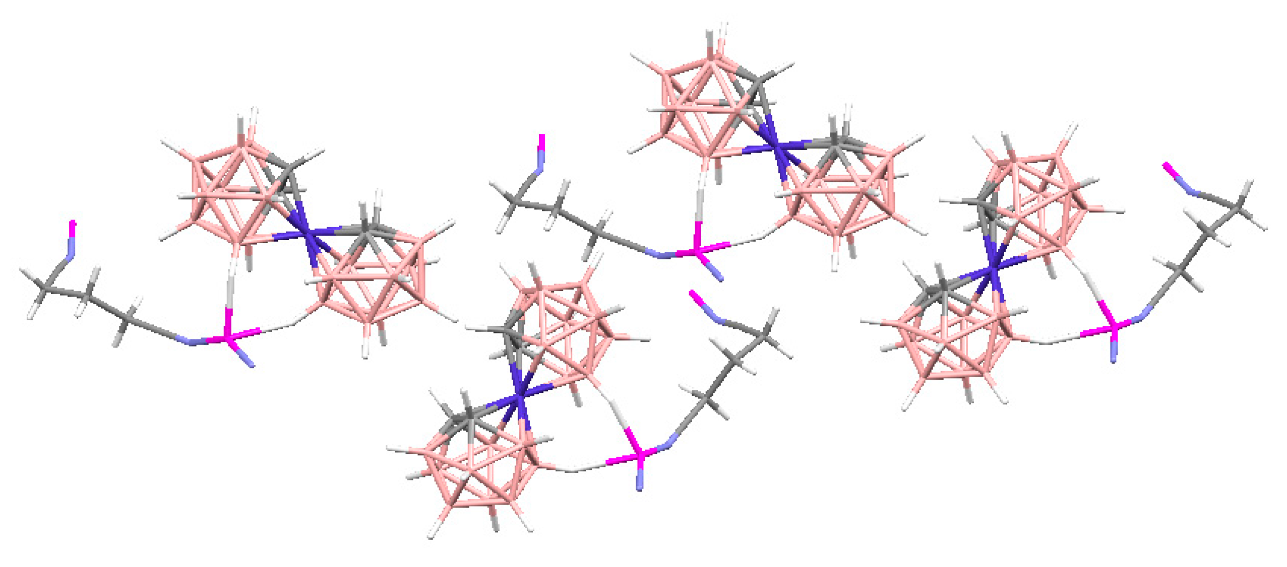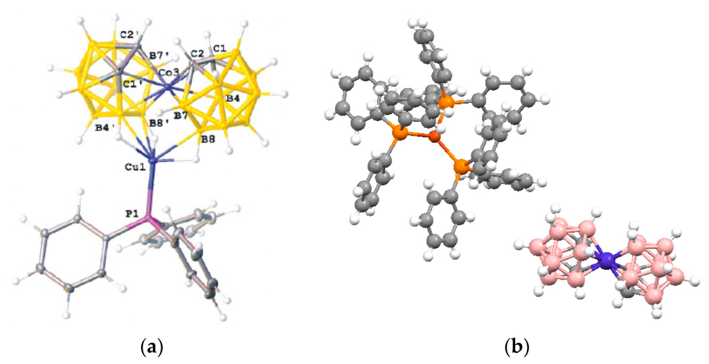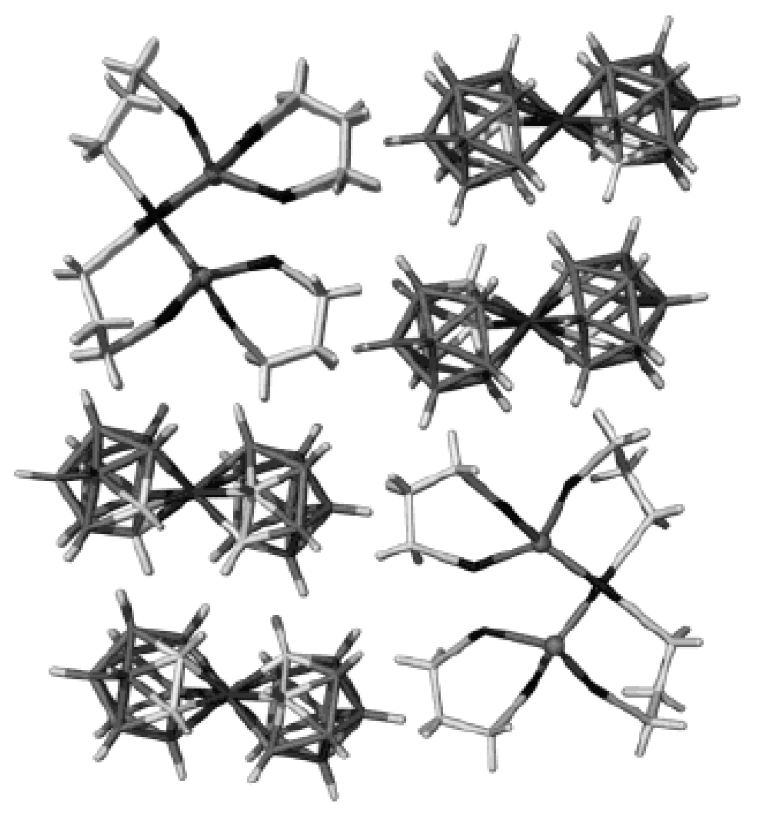 - Smol’yakov, A.F.; Korlyukov, A.A.; Dolgushin, F.M.; Balagurova, E.V.; Chizhevsky, I.T.; Vologzhanina, A.V. Studies of multicenter and intermolecular dihydrohen B-H…H-C bonding in [4,8,8’-exo-{PPh3Cu}-4,8,8’-(μ-H)3-commo-3,3′-Co(1,2-C2B9H9)(1’,2′-C2B9H10)]. Eur. J. Inorg. Chem. 2015, 2015, 5847–5855. [Google Scholar] [CrossRef]