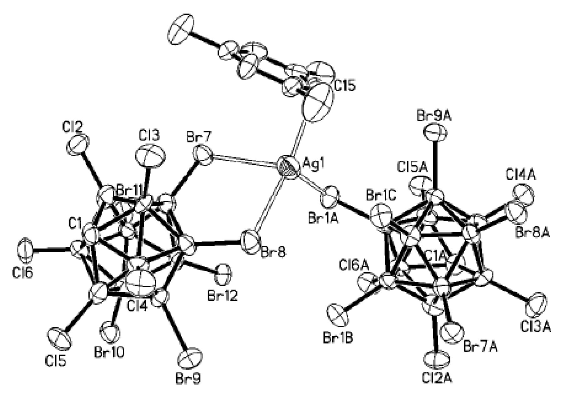 One of the most common ways to obtain compounds with stabilized reactive cations are metathesis reactions of relatively weak bonded halide complexes with univalent salts of weakly coordinating anions M[X]. In many cases, Ag+ is the best cation to abstract halide from substrate and the silver salt metathesis is a time-honored method of halide ion abstraction. Its origin dates back to the early days of coordination chemistry when silver nitrate was established as the standard testing reagent to differentiate free and complexed chloride. More recently, the availability of numerous silver salts of weakly coordinating anions, Ag[X] (X = ClO4−, SbF6−, etc.), have exceeded silver salt metathesis as the widely used method of halide ion abstraction. The polyhedral borane and carborane anions owing to their large size and relative low charge can be considered soft bases. On the other hand, Ag+ and Cu+ cations are typical soft acids that should result in formation of great number of complexes of various structural types [7].