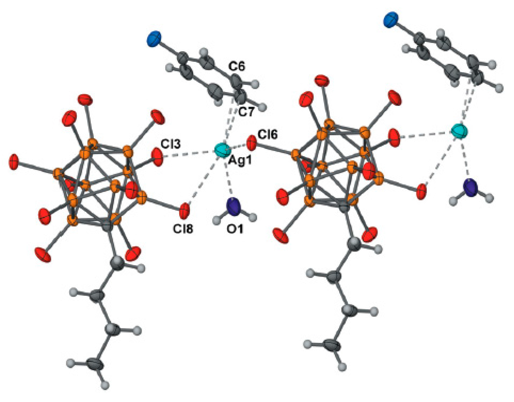 - Kochneva, I.K.; Avdeeva, V.V.; Polyakova, I.N.; Malinina, E.A. Mixed-ligand polymeric and binuclear silver(I) complexes with the dodecahydro-closo-dodecaborate anion and bipyridylamine. Polyhedron 2016, 109, 19–25. [Google Scholar] [CrossRef]