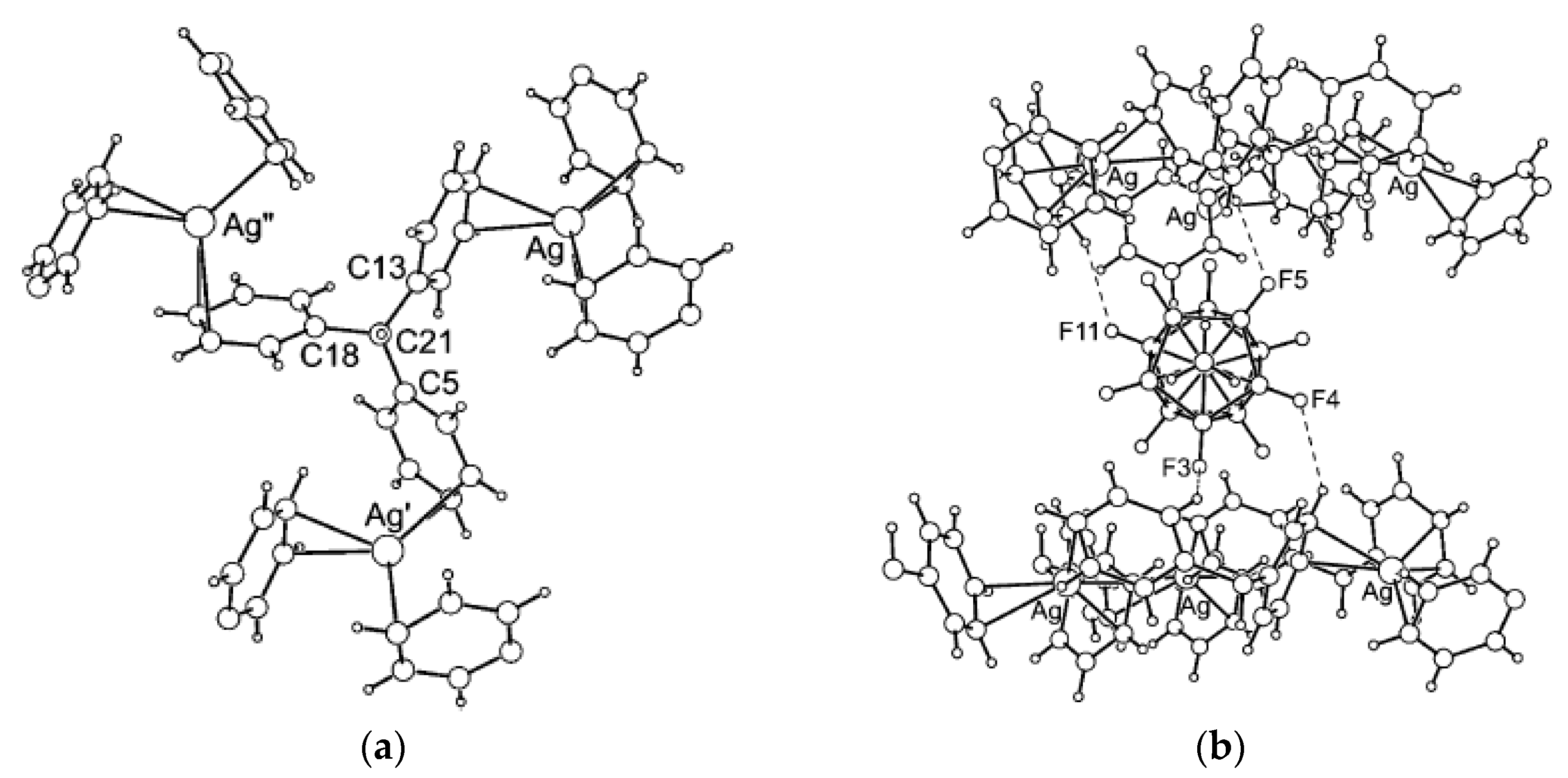 - Ivanov, S.I.; Miller, S.M.; Anderson, O.P.; Strauss, S.H. Structure of Ag(CHPh3)(1-Me-CB11F11). Trigonal-planar Ag(Arene)3+ cations, polymeric {Ag(CHPh3)+}∞ triangular-net layers, and partially aligned interstitial carborane anions in a polar crystal. Cryst. Growth Des. 2004, 4, 249–254. [Google Scholar] [CrossRef]