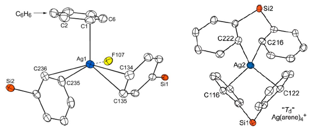 - Kobayashi, Y.; Popov, A.A.; Miller, S.M.; Anderson, O.P.; Strauss, S.H. Synthesis and structure of Ag(1-Me-12-SiPh3-CB11F10): Selective F12 substitution in 1-Me-CB11F11− and the first Ag(arene)4+ tetrahedron. Inorg. Chem. 2007, 46, 8505–8507. [Google Scholar] [CrossRef] [PubMed]