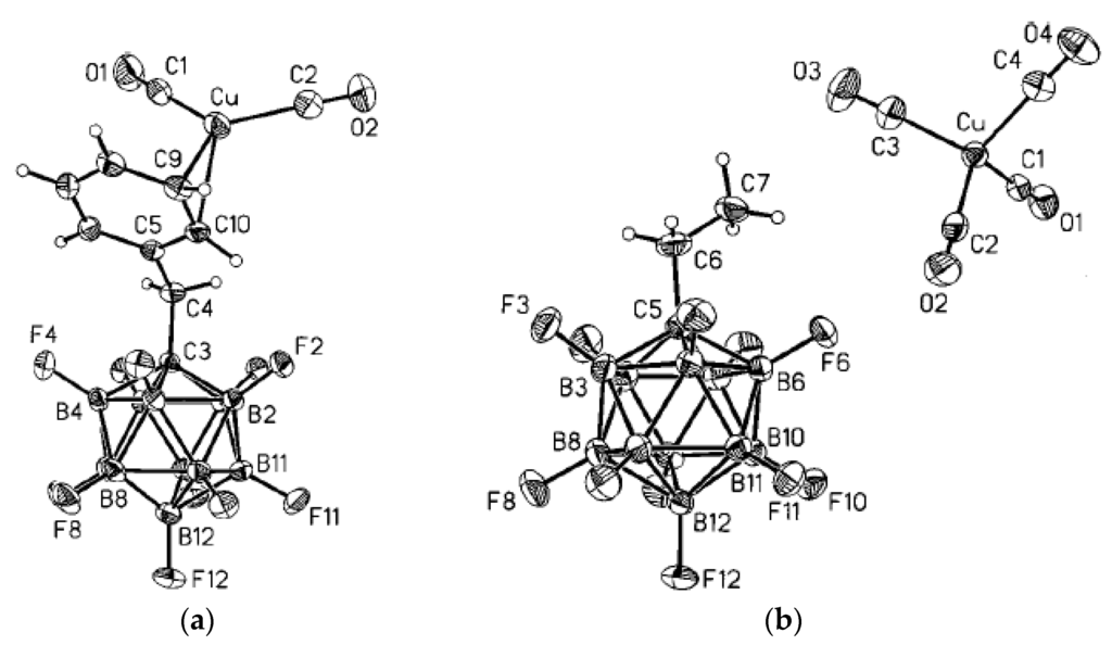 - Ivanova, S.M.; Ivanov, S.V.; Miller, S.M.; Anderson, O.P.; Solntsev, K.A.; Strauss, S.H. Mono-, di-, tri-, and tetracarbonyls of copper(I), including the structures of Cu(CO)2(1-Bn-CB11F11) and [Cu(CO)4][1-Et-CB11F11]. Inorg. Chem. 1999, 38, 3756–3757. [Google Scholar] [CrossRef]