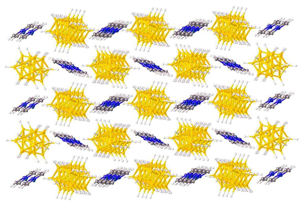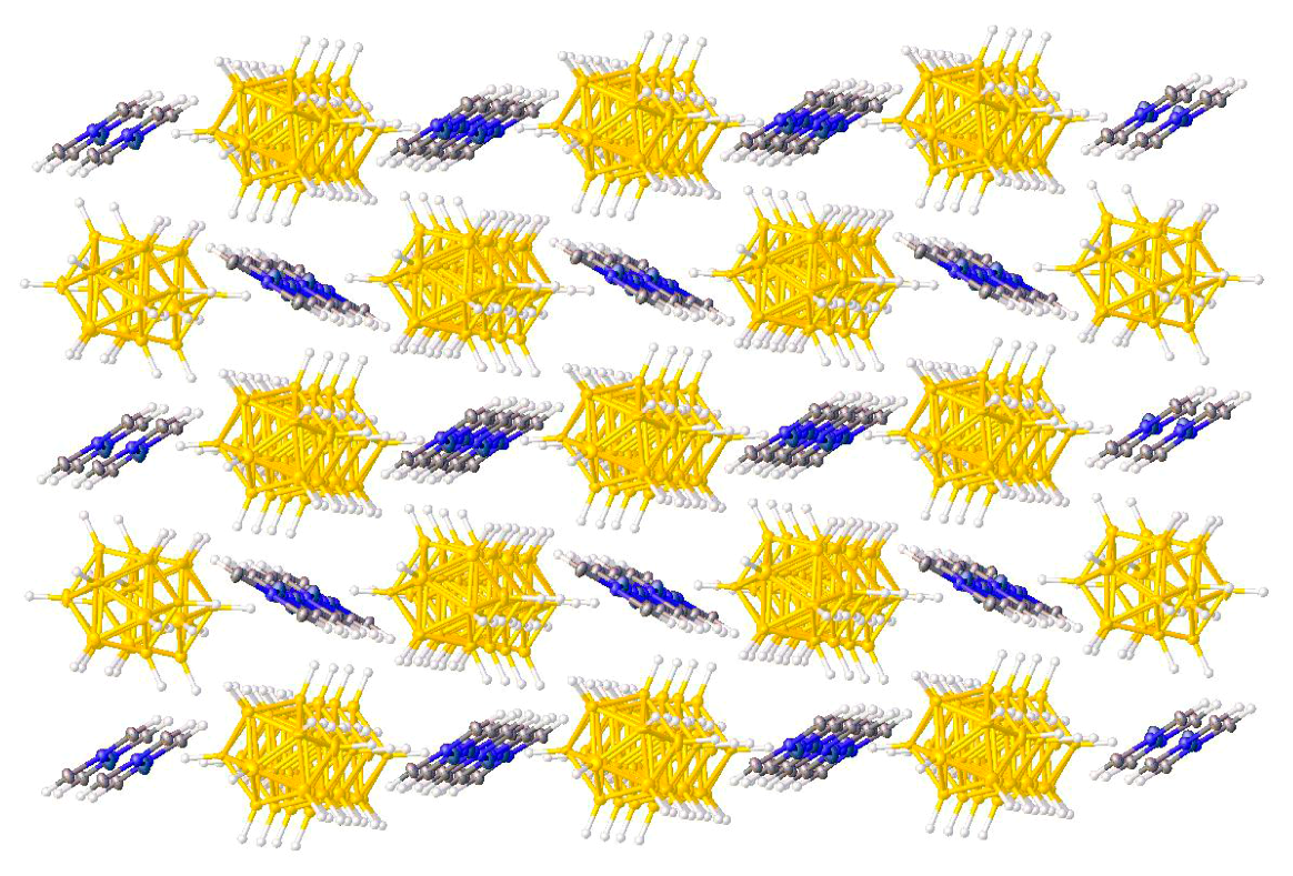 The reaction of CuSO4·5H2O with an excess of 1,10-phenanthroline in DMF results in qualitative precipitation of copper(II) complex [Cu(Phen)2][B10H10]. The crystal of [Cu(Phen)2][B10H10] is built of the [Cu(Phen)2]2+ cations and the [B10H10]2− anions. The copper cation is in distorted plane square coordination (Cu-N bonds are 1.9962(12) Å, N-Cu-N angles are 83.04(7), 101.29(7) and 157.73(7)°). The closo-decaborate anions approach the complex cation on either side (Cu…B and Cu…H contacts are 3.545(17) and 2.85(19) Å, respectively). The [Cu(Phen)2]2+ cations and the [B10H10]2− anions alternate in the a direction (Figure 23) [43].