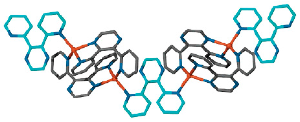 The listed above positional isomers belong to complexes with the closo-decaborate anion that coordinates metal atoms by two edges. However, a few examples of the facial coordination of the closo-decaborate anion were revealed. The reactions of Cu2[B10H10] with chelate ligands 2,2′-bipyridine (2,2′-Bipy) and 1,10-phenanthroline (Phen) in acetonitrile result in formation of copper(I) complexes {((L)Cu)2[B10H10]} with facial and mixed edge-facial coordination mode of metal atoms by the closo-decaborate anion [42]. In the complex {((2,2′-Bipy)Cu)2[B10H10]} the boron cluster coordinates metal atoms by apical B(1)-B(2) edge and the opposite B(6)-B(7)-B(10) face (or the corresponding B(8)-B(9)-B(10) face in other enantiomer). The Cu…B bonds fall in the range from 2.156(7) to 2.256(7) Å (Figure 19).