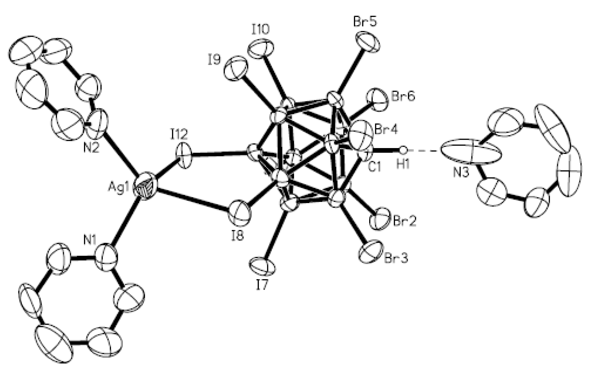 - Tsang, C.-W.; Yang, Q.; Mak, T.C.W.; Xie, Z. Synthesis and crystal structure of silver and argentite complexes of mixed halocarborane anions, (C5H5N)2Ag(1-H-CB11Br5I6) (C5H5N) and [{(CH3CN)4Ag3}{Ag(CB11I5Br6)2}]n. Appl. Organomet. Chem. 2003, 17, 449–452. [Google Scholar] [CrossRef]