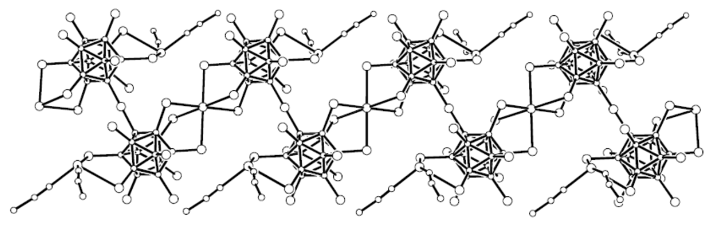 In the structure of {(Ph4P)(Cu[B10H10])}n the copper cation is coordinated by two closo-decaborate anions through single Be-H groups (Cu…B 2.160 and 2.187 Å) [27] forming infinite polymeric chain (Figure 5).