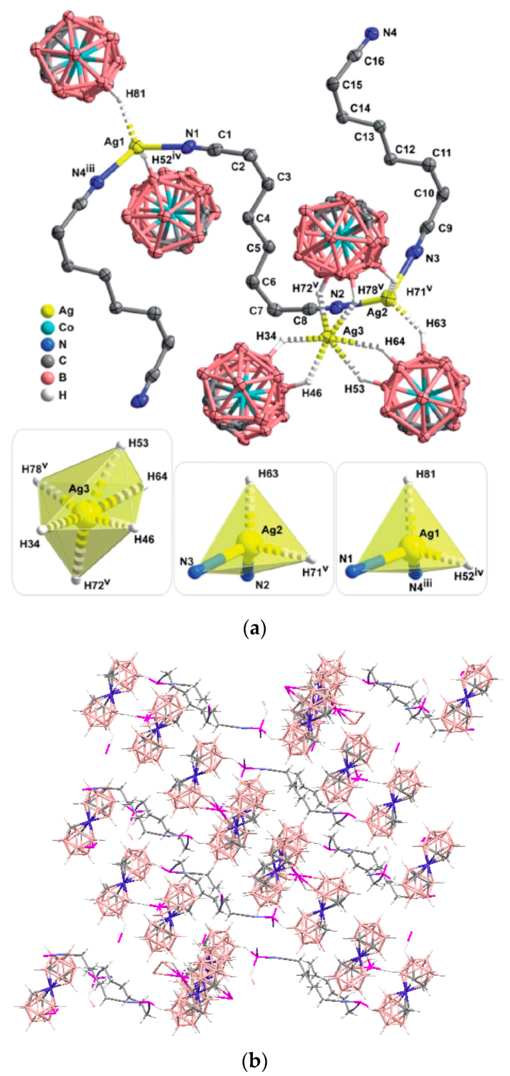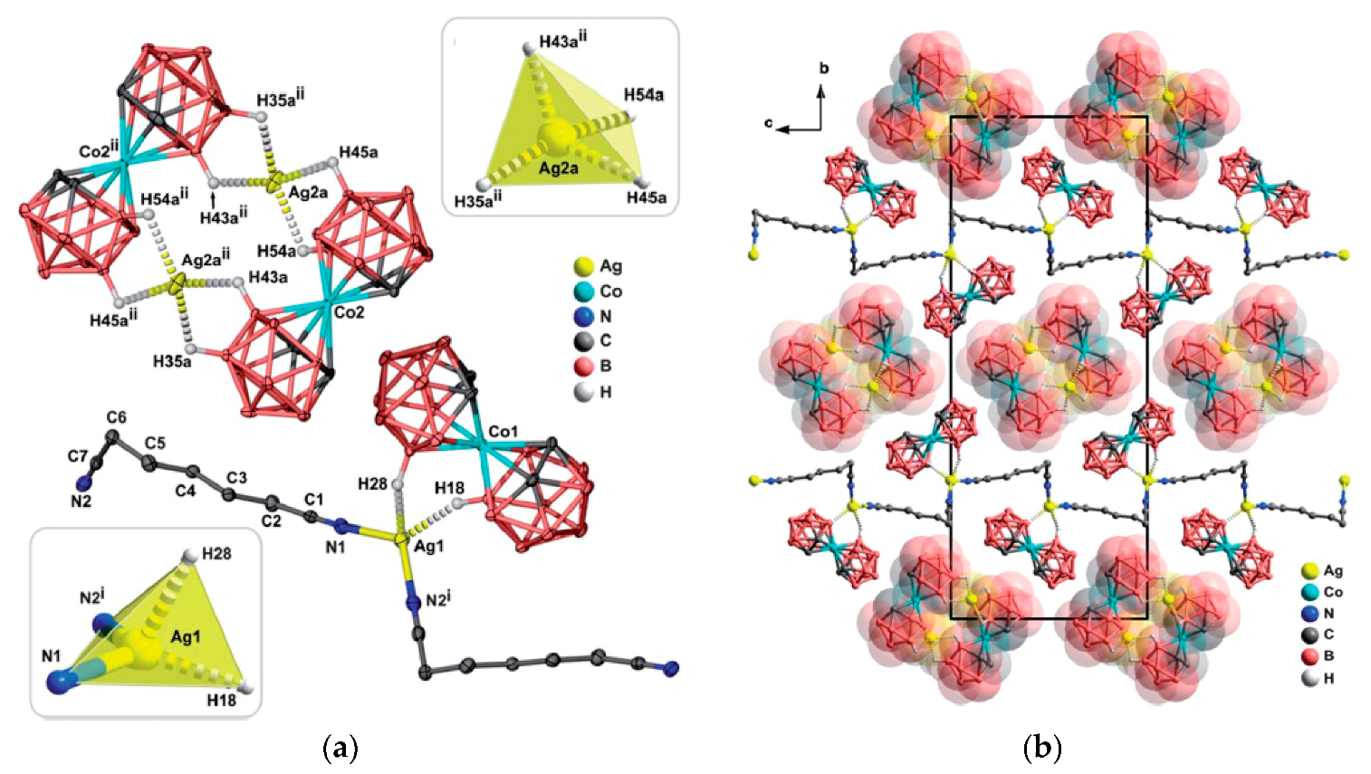 - Cunha-Silva, L.; Hardie, M.J. Exploring Ag/H–B interactions in coordination polymers: Silver-alkanedinitrile networks with cobalt carbaborane anions. CrystEngComm 2012, 14, 3367–3372. [Google Scholar] [CrossRef]