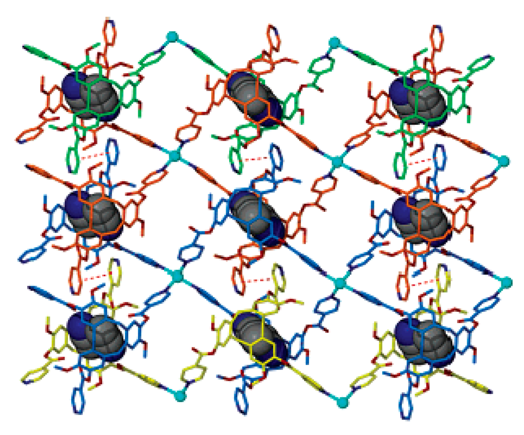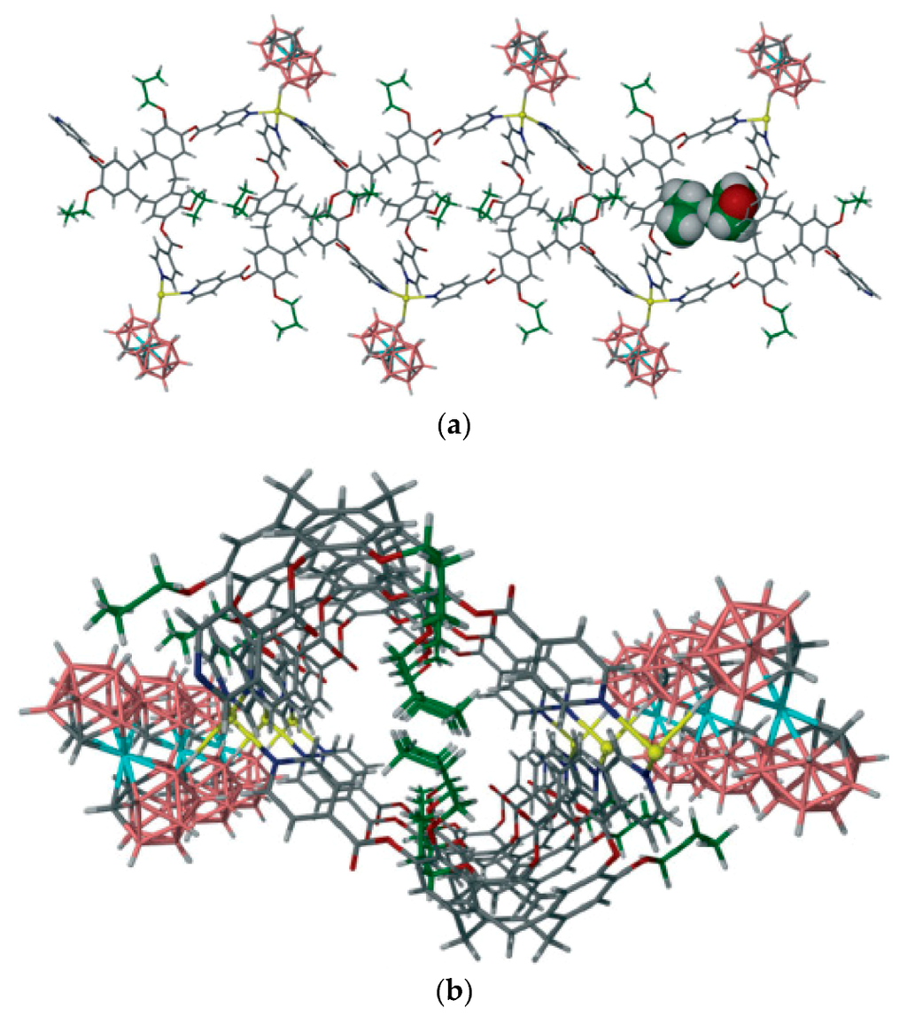 - Hardie, M.J.; Sumby, C.J. Interwoven 2-D coordination network prepared from the molecular host tris(isonicotinoyl)cyclotriguaiacylene and solver(I) cobalt(III) bis(dicarbollide). Inorg. Chem. 2004, 43, 6872–6874. [Google Scholar] [CrossRef] [PubMed]