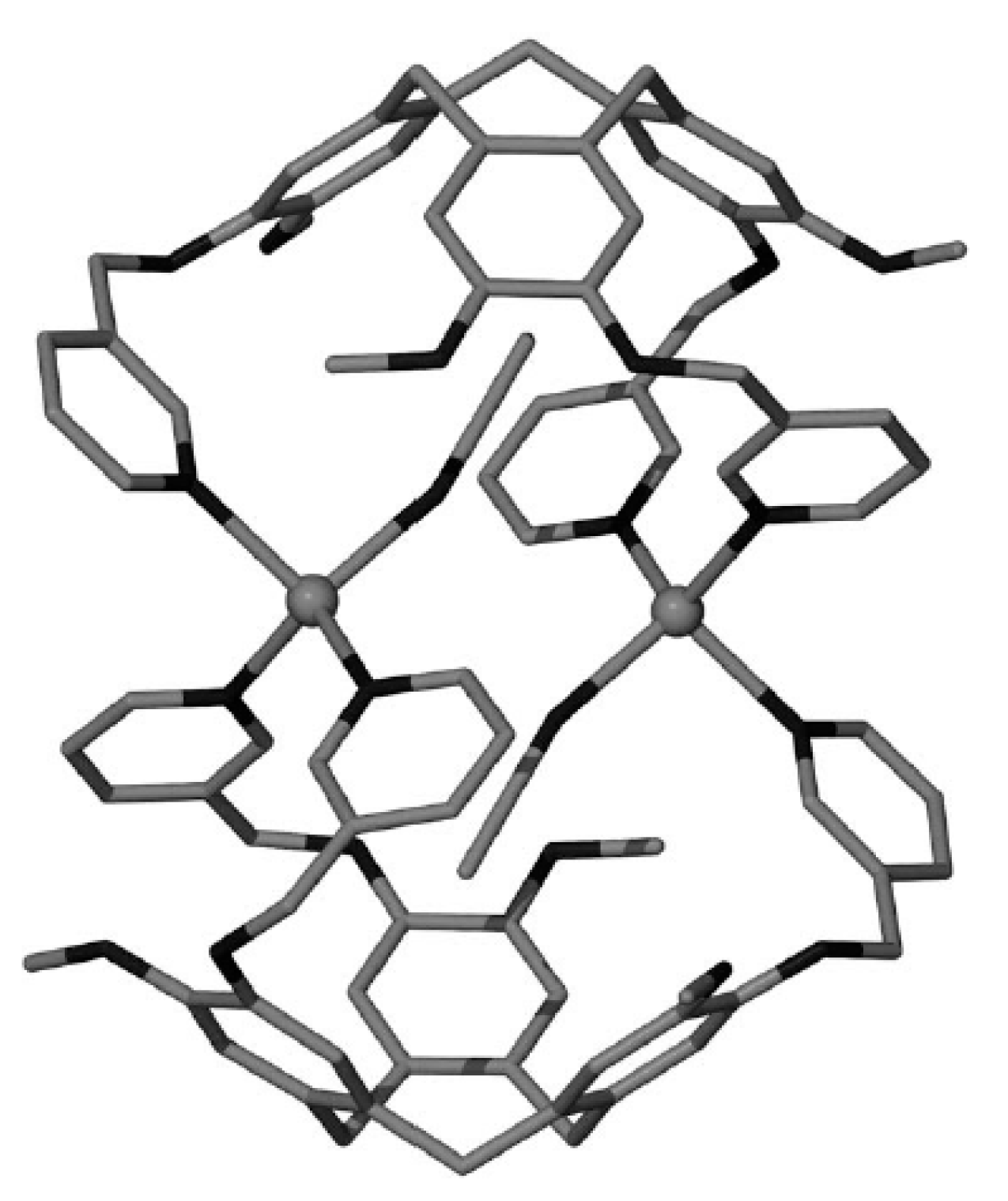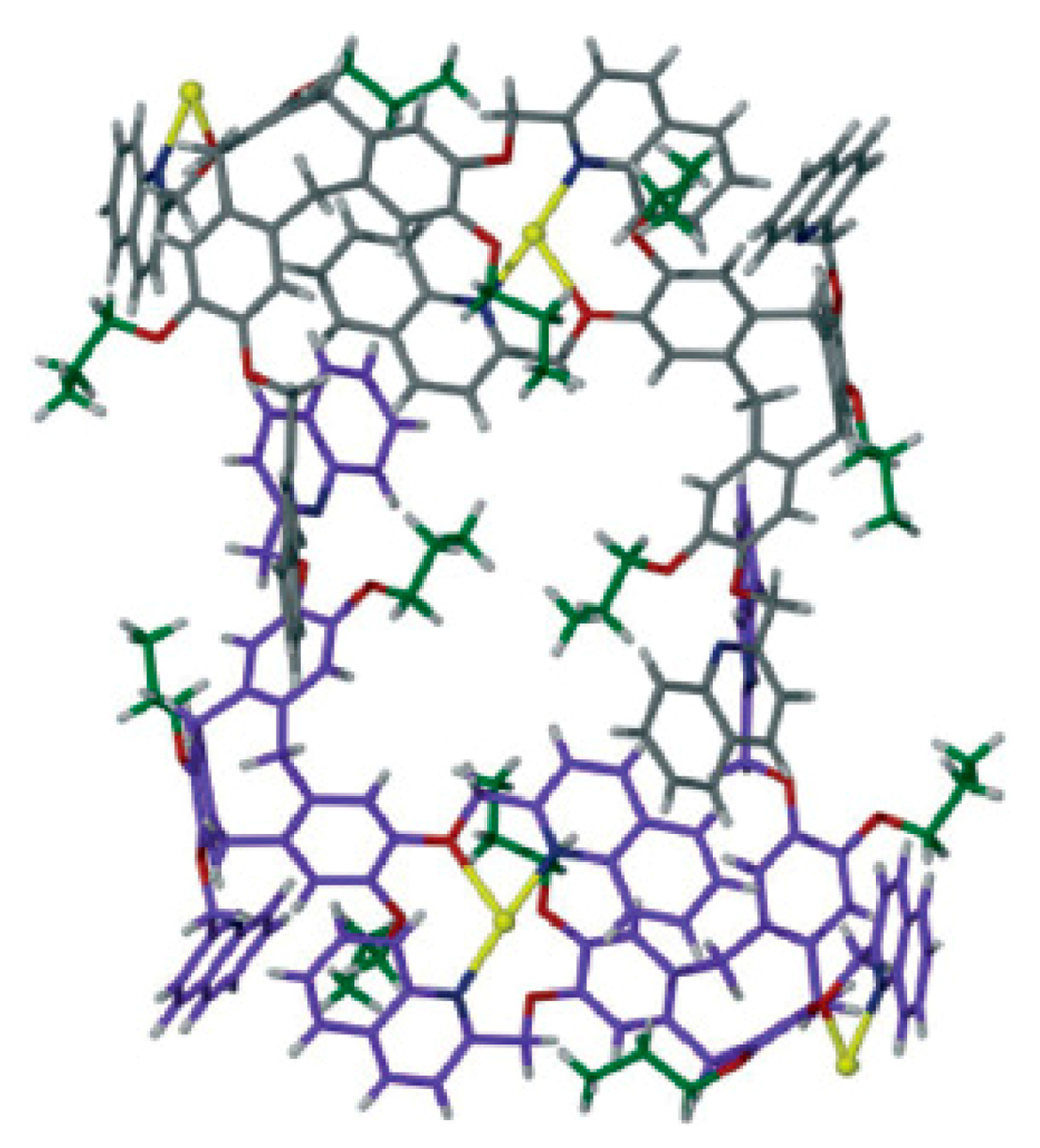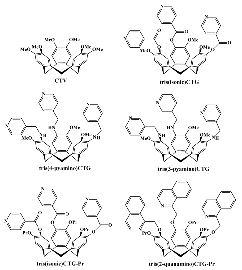 - Sumby, C.J.; Fisher, J.; Prior, T.J.; Hardie, M.J. Tris(pyridylmethylamino)-cyclotriguaiacylene cavitands: An investigation of the solution and solid-state behavior of metallo-supramolecular cages and cavitand-based coordination polymers. Chem. Eur. J. 2006, 12, 2945–2959. [Google Scholar] [CrossRef] [PubMed]