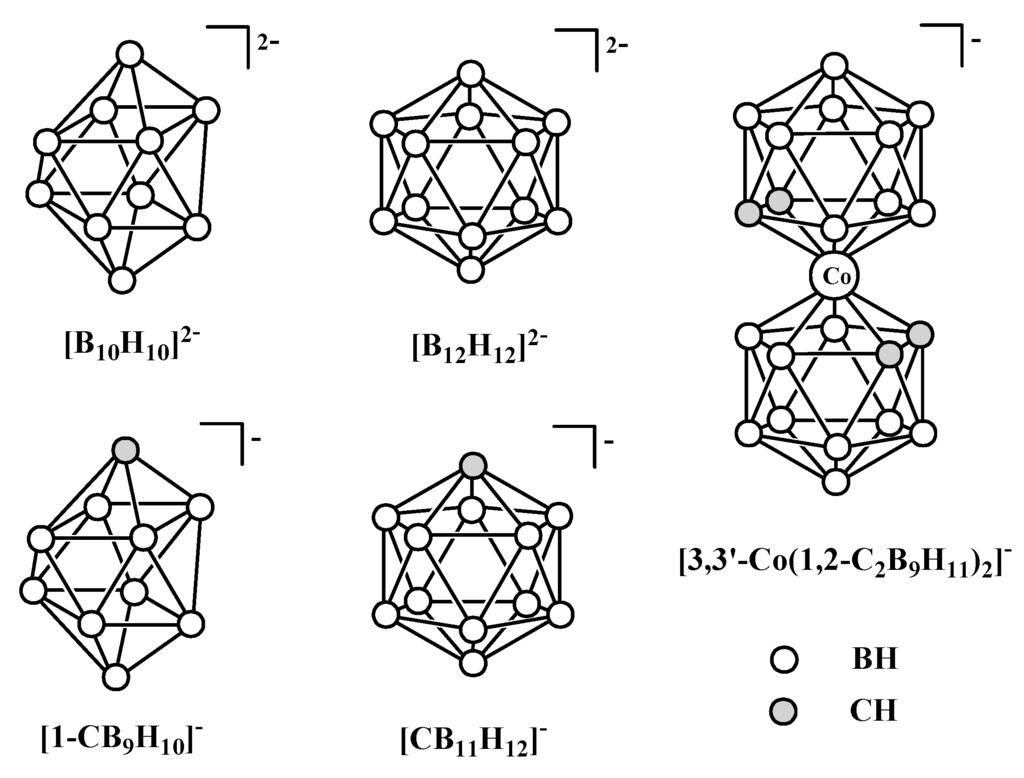 Among the systems that are held together by weak interactions are compounds containing reactive electrophilic p-block cations and transition metal complex cations. As a rule, such cations can be stabilized by so-called “non-coordinating anions”, the term which was first coined to describe anions such as ClO4−, SO3CF3−, BF4−, PF6−, AsF6− and SbF6−. These anions usually are non-coordinating in aqueous solution, however with development of routine X-ray crystallography it has become evident that in many cases a “non-coordinating” complex anion can in fact easily coordinates to a metal in the solid state. Accordingly, the term “weakly coordinating anions” was proposed for the coordination for these anions. Due to capability of such anions to stabilize reactive electrophilic cations, their use as counter anions is of significant interest in both synthesis and catalysis. Owing to the importance of weakly coordinating anions in fundamental and applied chemistry, there is growing interest in synthesis of “the least coordinating anions”. Polyhedral boranes and carboranes ([B10H10]2−, [B12H12]2−, [1-CB9H10]−, [CB11H12]−, [3,3′-Co(1,2-C2B9H11)2]− (Scheme 1)) and especially their halogen derivatives are usually considered as weakly coordinating anions that are able to stabilize highly reactive electrophilic p-block cations and transition metal complex cations [3,4,5,6].