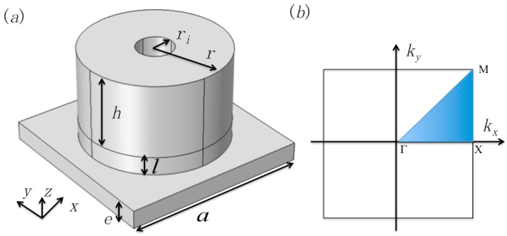 (a) schematic view of the PnC unit cell in the square array consisting of hollow pillars deposited on a thin homogeneous plate with an additional cylinder of height l at the basis to improve the confinement of the modes in the hollow pillars. a is the lattice constant, e is the thickness of plate, h is the height of hollow pillar, ri and r are the inner and outer radius of the hollow pillar, respectively; (b) the irreducible first Brillouin zone of the square lattice.