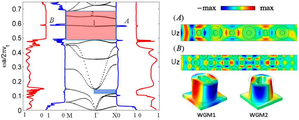 In Figure 2, we present more detailed properties of the WGMs. In the left panel, the black dotted lines are dispersion curves calculated along the ΓX and ΓM directions of the first Brillouin zone with geometric parameters ri/a = 0.145, r/a = 0.4, h/a = 0.45, e/a = 0.1, l/a = 0.2. With this set of parameters, the Bragg and low frequency band gaps still appear along ΓX direction while only a Bragg band gap remains along the ΓM direction. In the Bragg band gap, two branches of WGMs occur, marked as branch ‘1’ and ‘2’. Two transmission spectra along each direction are associated with two different incident waves, namely the fundamental anti-symmetric A0 Lamb (blue curve) and the symmetric S0 (red curve) Lamb waves. Although some mode conversion can occur at the exit of PnC, the transmitted wave keeps essentially its original character. Only WGM1 gives rise to a narrow transmitted pass band in both the ΓX and ΓM directions, more significantly with anti-symmetric Lamb wave excitation, marked as peak ‘A’ and ‘B’. In the right panel of Figure 2, we show the displacement fields of the dominant Uz component (displacement along z-axis) for peak ‘A’ and ‘B’. The excitation inside the PnC is symmetric with respect to an xz plane, perpendicular to the pillars and parallel to the propagation direction. This is in accordance with the symmetry of the incident wave (either A0 or S0) with respect to such a plane. In contrast, to obtain a transmission at the frequency of WGM2, it would be necessary to have an incident wave which has an antisymmetric profile with respect to this plane, which means −/+ force in the unit cell along the y-direction. To explain the higher transmission of WGM1 with the A0 rather than S0 incident wave, it should be noticed that the x and y components of its displacement field are mainly localized in the upper part of the pillar, around the hollow part, while the z component extends down to the bottom of the pillar and is therefore sensitive to a vertical motion in the membrane. However, in some other frequency ranges such as [0.2; 0.4], the transmission is much higher with S0 rather than A0 excitation.